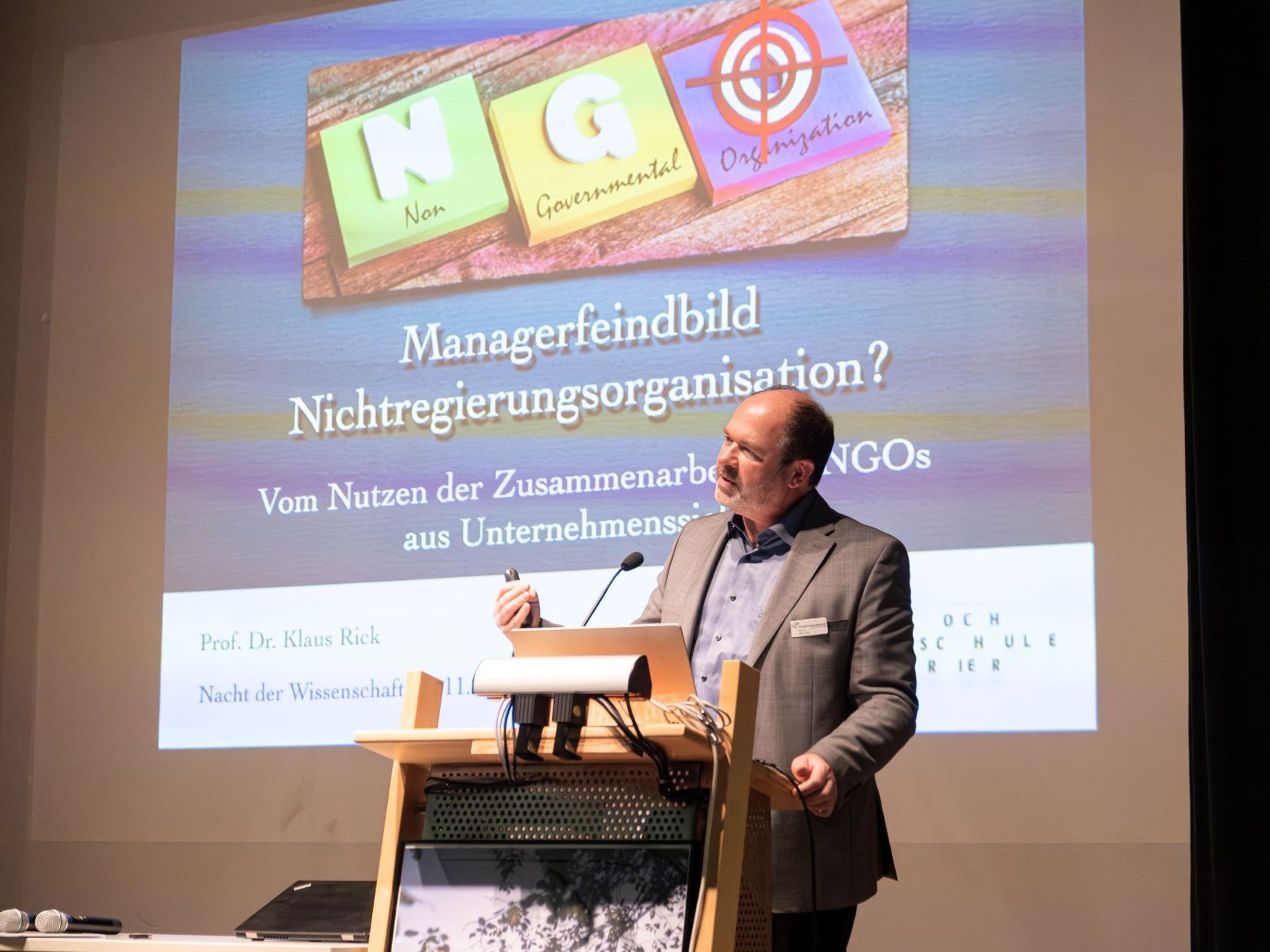 Im dritten Vortrag referierte Prof. Dr. Klaus Rick zur Thematik „Managerfeindbild Nichtregierungsorganisation? Vom Nutzen der Zusammenarbeit mit NGOs aus Unternehmenssicht“. Manche Manager sehen NGOs immer noch eindimensional als Profitbremse. Die Erfahrung zeigt jedoch, dass sich eine ganze Reihe von Chancen durch eine vertrauensvolle Zusammenarbeit ergeben. Seriöse Umweltverbände und etablierte soziale Einrichtungen bieten viele Möglichkeiten, durch Kooperationen mit fortschrittlich denkenden Unternehmen den Nutzen für Mensch und Umwelt neben die Produktivität, den Umsatz und Gewinn zu stellen – und so einerseits eine wirtschaftlich tragfähigere Zukunft und andererseits zugleich Gemeinwohl zu fördern. Der Vortrag verdeutlichte dies an mehreren Beispielen und gab einen Einblick in die NGO-Arbeit, die als bürgernahes Korrektiv seit Jahrzehnten Politik und Wirtschaft positiv beeinflusst.