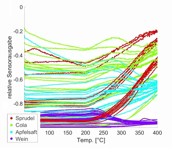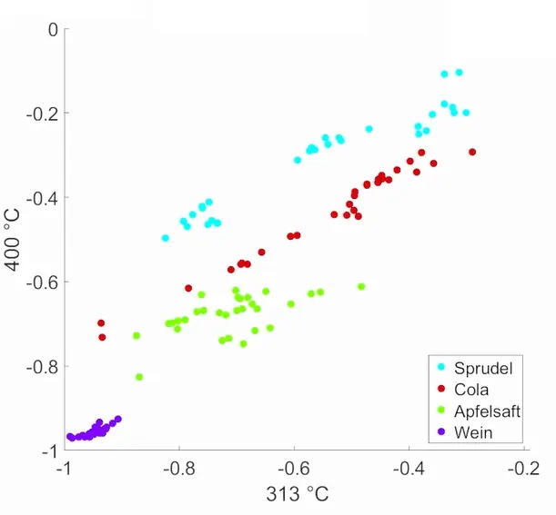 Im Rahmen dieses Versuchs werden zunächst wiederholt die Widerstände für alle Getränkeklassen gemessen, während der Sensor langsam von 30 °C bis hoch zu 400 °C aufheizt. Nach Schritten von jeweils 1 °C wird der Messwert abgefragt, dies ergibt 371 Werte bzw. Features pro Messung. Ziel dieser langen Messreihen ist, diejenigen Temperaturstufen zu finden, bei deren Kombination sich die beste Unterscheidbarkeit der vier Klassen ergibt, dies geschieht dann in der Vorverarbeitung.