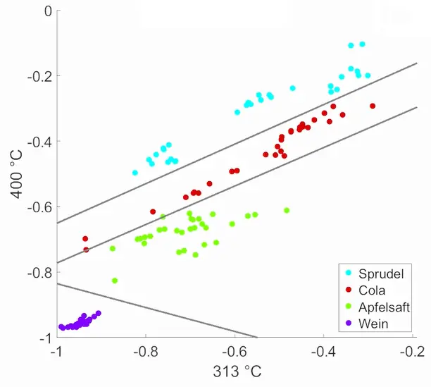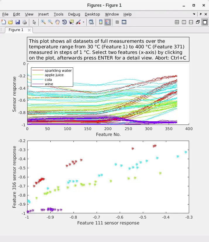 Die zum Versuch gehörenden Skripte zeigen die verschiedenen Schritte des Versuchs (siehe Dateien unten) anhand eines Beispieldatensatzes. Dieser Beispieldatensatz besteht aus vier Klassen (Apfelsaft, Cola, Wein und kohlensäurehaltiges Mineralwasser aka Sprudel) à 20 Messungen. Jede Messung besteht aus einem 371-dimensionalen Vektor, mit den nach der Formel in Versuchsaufbau verrechneten Sensorwerten zu dem Temperaturen 30 °C bis 400 °C. Die Temperaturen wurden aufsteigend gemessen, jede Temperatur wurde dabei so lange gehalten, bis der vom Sensor aufgenommene Wert stabil war.