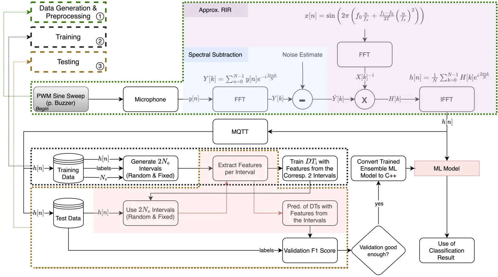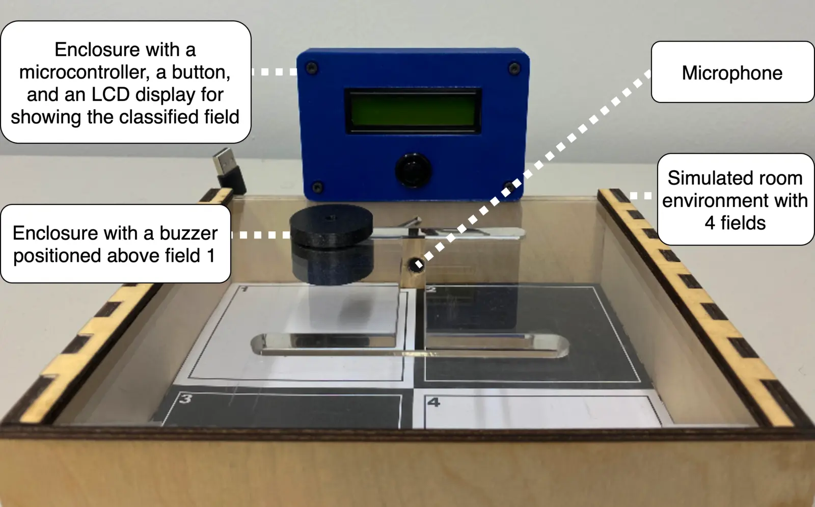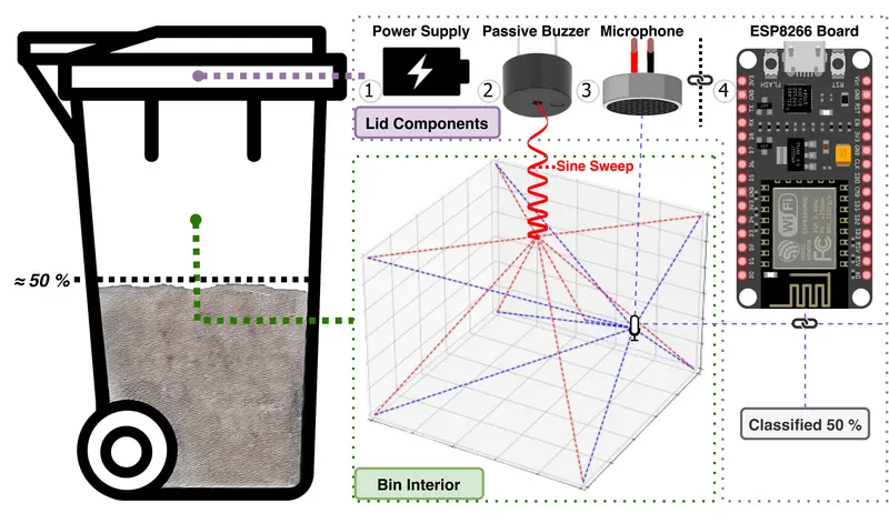 Der hier vorgestellte Intelligente Abfallbehälter nutzt hörbare akustische Signale, um den aktuellen Füllstand zu bestimmen. Ein Sinussignal, dessen Frequenz über die Zeit ansteigt (Sweep), wird in den Behälter gesendet. Anschließend erfasst ein Mikrofon sowohl das direkt eintreffende Signal als auch die Reflexionen innerhalb des Behälters. Auf Basis dieser Aufzeichnungen wird mithilfe eines speziell hierfür entwickelten KI-Modells namens SIREC (Sonic Impulse Response Ensemble Classifier) der Füllstand vorhergesagt. Die Besonderheit hierbei ist, dass die gesamte Auswertung lokal auf einem kostengünstigen ESP8266-Board erfolgen kann und damit keine aufwendige Server-Infrastruktur notwendig ist.