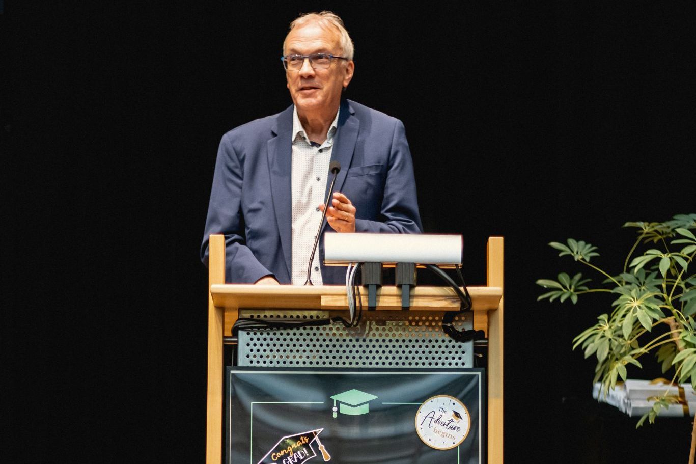 Landrat Udo Recktenwald betonte in seinem Grußwort die enge und langjährige Kooperation zwischen Campus und Landkreis St. Wendel und bezeichnete den Umwelt-Campus als Standortvorteil, sowohl für den Heimatlandkreis Birkenfeld also auch für St. Wendel. Er rief die Absolventinnen und Absolventen dazu auf, ihre erworbenen Kompetenzen in der Region einzusetzen und unterstrich das gemeinsame Verständnis über Nachhaltigkeit in der Regionalentwicklung. Der Landrat machte den Absolventinnen und Absolventen Mut „Ihnen steht jetzt die Welt offen. Sie haben im Studium gelernt Antworten zu finden, jetzt heißt es die richtigen Fragen zu stellen.“ und er schloss mit den Worten „Bleiben Sie mutig, damit Großes im Kleinen entstehen kann“.