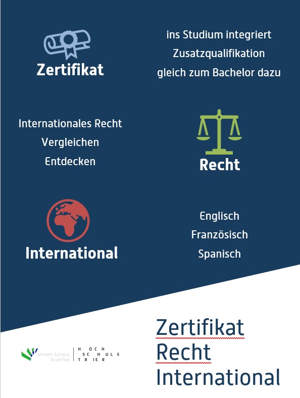 Auch wenn Sie nicht im LL.B. Umwelt- und Wirtschaftsrecht sind, können Sie am Zertifikat teilnehmen, solange Sie an der Hochschule Trier eingeschrieben sind. Vorraussetzung sind allerdings Grundkenntnisse des deutschen Rechts. Eine individuelle Beratung und Prüfung der Voraussetzungen ist erforderlich. (Kontakt: Prof. Dr. Kathrin Nitschmann)