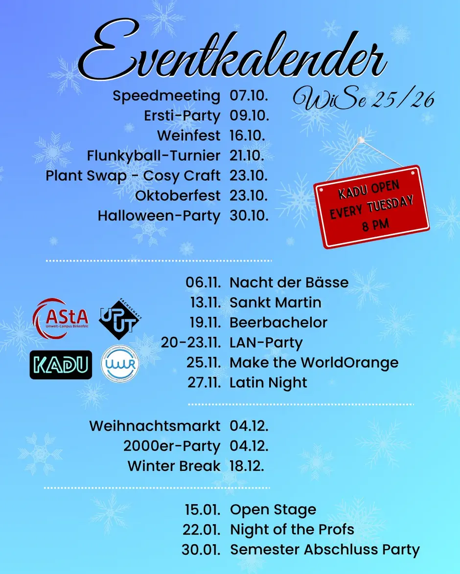 Seit dem Sommer 2023 hat der AStA die Campuskneipe übernommen. Mit einem engagierten Team aus Studierenden wird das Kadu jeden Dienstag ab 20 Uhr für euch geöffnet. Dabei sind ein gelegentlicher Bingo, Karaoke oder Quizabend durchaus auch dabei. Viele Veranstaltungen der Gremien finden ebenfalls im Kadu statt.