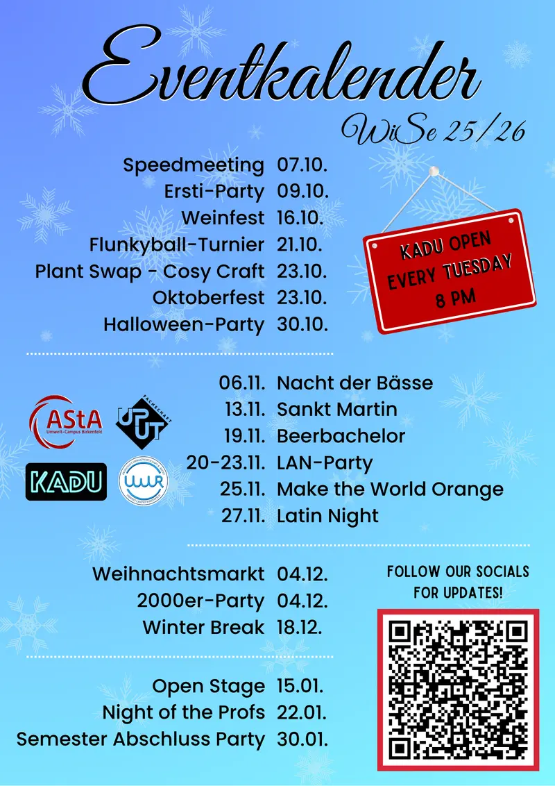 Alle weiteren Events und Infos findet ihr hier oder auf Instagram. Tretet außerdem unserer Signalgruppe bei, um immer auf dem neuesten Stand zu bleiben und keine Veranstaltung zu verpassen. Lasst uns den Campus in einem Winterwunderland verwandeln und das Wintersemester zu einem unvergesslichen Erlebnis machen!