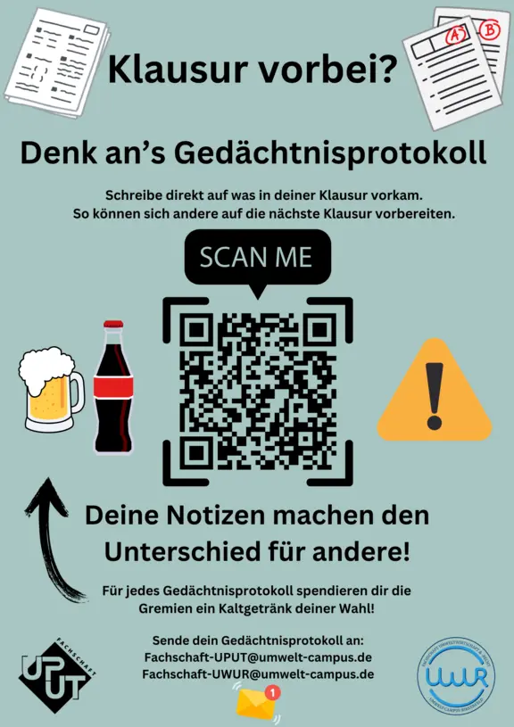 Bei uns bekommt ihr für viele Module des Fachbereichs Umweltwirtschaft & Umweltrecht aktuelle Altklausuren. Diese sind eine gute Hilfe zur Vorbereitung auf die Klausuren. Einfach per Mail oder persönlich während unserer Öffnungszeiten anfragen.