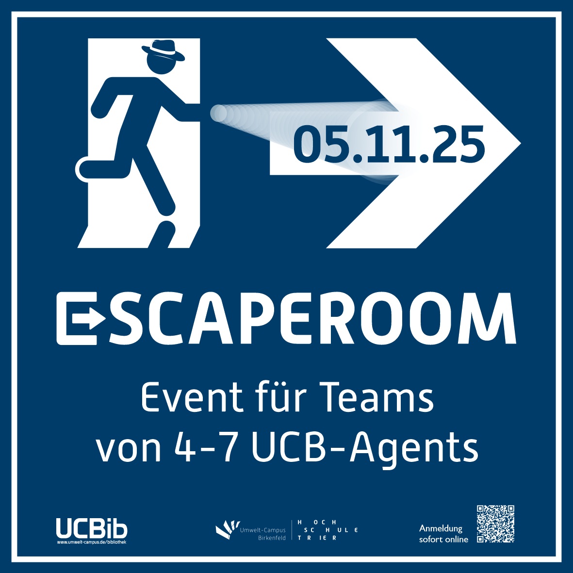 am 05.11.2025 wird die Bibliothek zum Escape-Room – und ihr könnt mit eurem Team von vier bis sieben UCB-Agents dabei sein. Bei spannenden Rätseln und jeder Menge Spaß könnt ihr beweisen, wie gut euer Teamgeist funktioniert, und aus dem abgeschlossenen Raum entkommen.