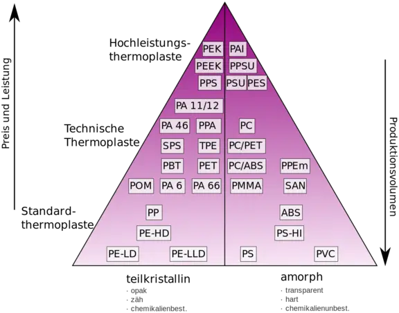 Bei oben abgebildete Pyramide zeigt einen Auszug aus den verfügbaren Kunststoffen. Nahezu alle dieser Kunststoffe sind inzwischen für das FFF-Verfahren verfügbar. Um den passenden Kunststoff für eine spezifische Anwendung zu finden, muss entsprechende Literatur zuhand genommen werden.