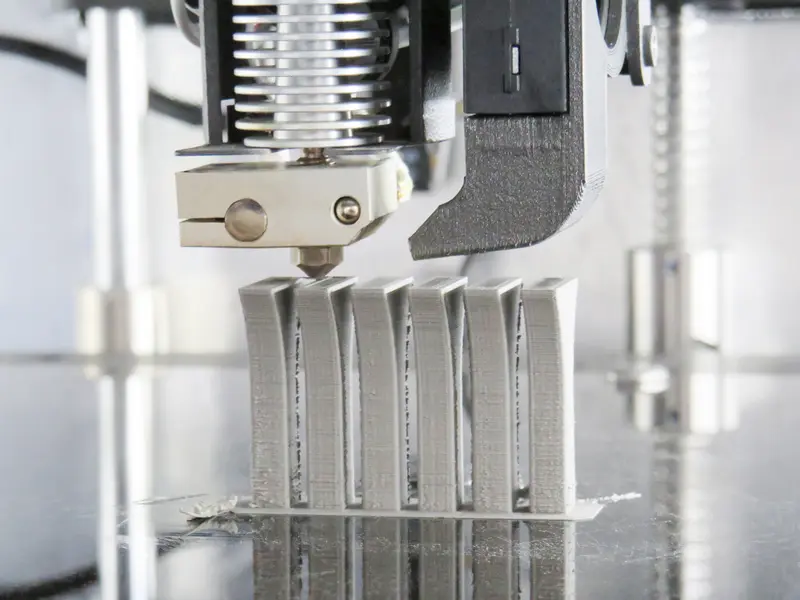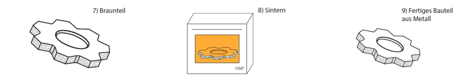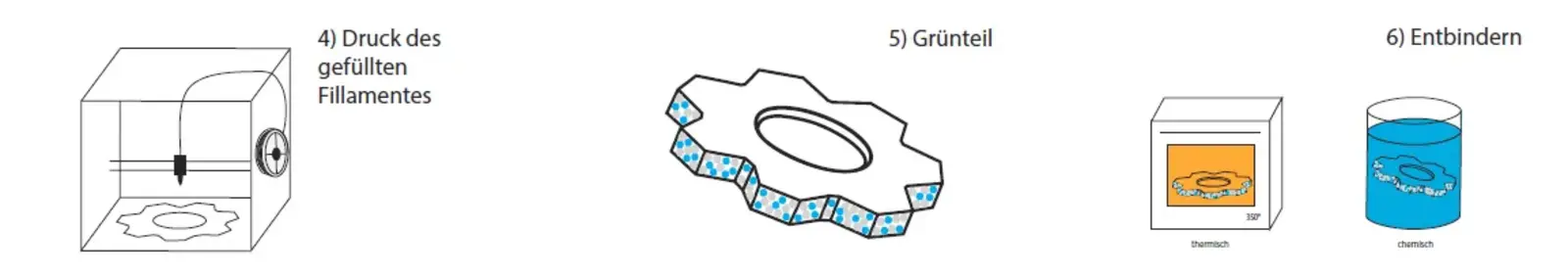 Ein spannendes Material für den FFF-3D-Druck ist ein Materialgemisch aus einer Polymermatrix und Metallpulver in einem Mischungsverhältnis von ca. 20/80. Dieses Material wir bereits seit Jahren in der Spritzgießtechnik verwendet und findet jetzt langsam Einzug in das FFF-Verfahren. Wenn mit diesem Material gedruckt wird sieht die Prozesskette zusätzlich Arbeitsschritte auf dem Weg zum fertigen Bauteil vor. Nach der Konstruktion des Bauteils muss es mit den entsprechenden Schrumpfungsfaktoren des Materials hochskaliert werden. Die Schrumpfung liegt, je nach Raumrichtung zwischen 16% und 20%. Wenn das Bauteil dann mit den entsprechenden Materialparametern gedruckt wird spricht man von einem Grünteil oder Grünling. Hier weicht die Prozesskette jetzt vom herkömmlichen FFF-Druck ab, da das Bauteil im Anschluss zunächst entbindert werden muss. Das bedeutet, das Bindermaterial wird vom Stahl getrennt. Dies kann thermisch, unter als auch chemisch, unter Verwendung von Salpetersäure, geschehen. Was nach diesem Prozess übrig bleibt wird als Braunteil bezeichnet. Es ist ein "Stahlskellet", der von einem Rest Bindemittel zusammengehalten wird. Dieses sehr instabile Bauteil wird dann zum Sinterprozess übergeben. Hier wird das Bauteil langsam auf eine bestimmte Temperatur erhitzt und verweilt dort für mehrere Stunden. Dabei schrumpft das Bauteil zusammen und wird zu einem festen Metallteil. Nach dem Abkühlen kann das Teil nachbearbeitet werden und zum Einsatz kommen.