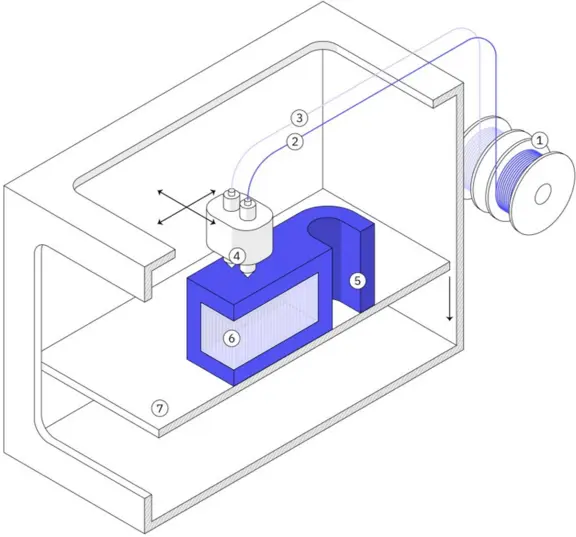 Das am weitest verbreitete Druckverfahren ist das Fused Filament Fabrication Verfahren. Das Verfahren wurde ende der 80er Jahre von der Firma Stratasys erfunden und in den 90er Jahren unter dem geschützen Name "Fused Deposition Modeling (FDM)" geschützt. Das Prinzip beruht auf dem Schichtaufbau mit thermoplastischen Kunststoffen. Der Drucker wird mit dem gewünschten Filament bestückt und ist somit zum drucken vorbereitet. Das Filament wird durch einen Antrieb (Extruder) bis zum Druckkopf (Hot End) gefördert. Der Druckkopf erhitzt das Material auf seine Schmelztemperatur wodurch das Kunststoff in der Düse (Nozzle) zähflüssig wird. Durch das permanente fördern des Materials wird das verflüssigte Material aus der Düse gepresst und kann somit zum Schichtaufbau aufgetragen werden. Um mit diesem Material ein Model abbilden zu können benötigt der Drucker noch Informationen, den G-code. Dabei handelt es sich um eine Maschinensprache die ebenso in kommerzieller spanender Fertigung verwendet wird. Diese übersetzt die Konturen des Models, unter berücksichtigung der entsprechenden Maschinenparameter wie Düsendurchmesser, Schichthöhe, Druckgeschwindigkeiten usw., in Koordinaten die der Druckkopf anfährt, gepaart mit dem Materialvorschub. Dadurch wird das gewünschte Druckmodel Schicht für Schicht aufgebaut. Die Parameter sind natürlich abhängig vom gewünschten Material oder dem Qualtitätsanspruch an das Bauteil.
