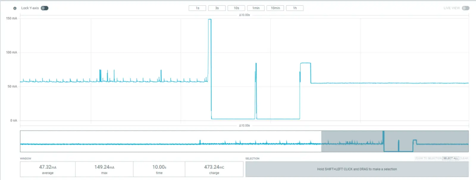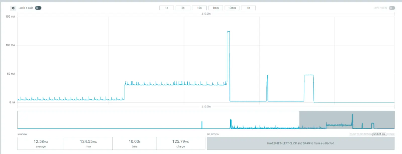 Dann wirst du sehen, dass dein Messzyklus nur kurz höhere Ströme zieht und danach für den Großteil der Zeit auf (fast) 0 mA absinkt. Das siehst du dann im Power Profiler als kurze „Peaks“ und einen kaum messbaren Sleep-Strom.