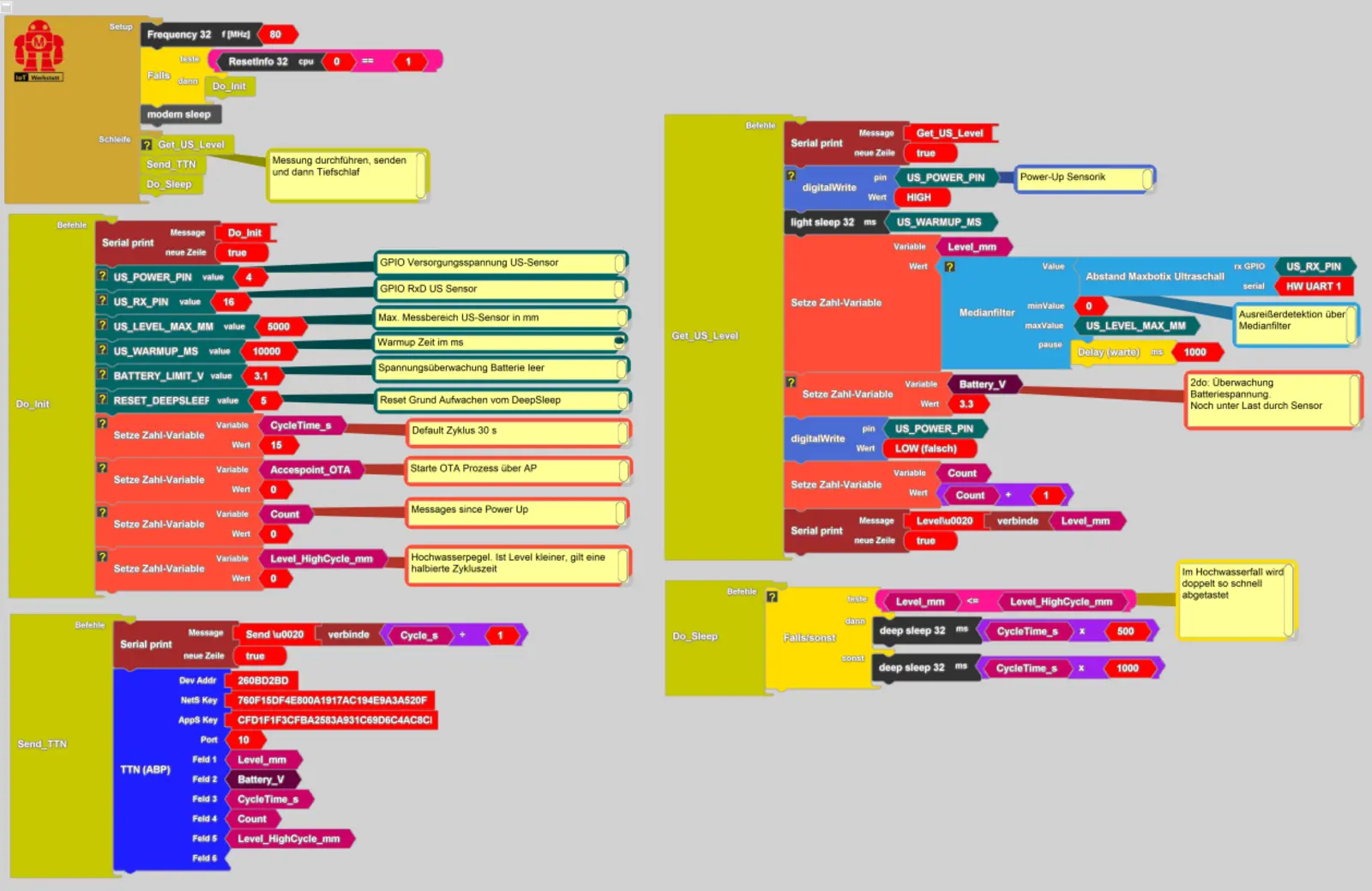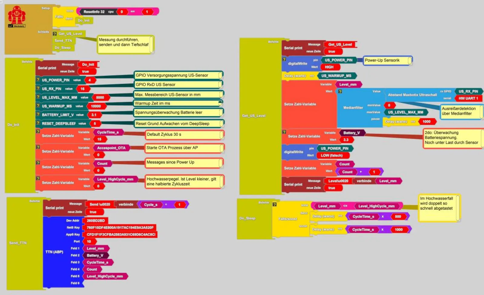 Technische Basis des energieautarken Pegelmesssystems bildet ein ESP32-Mikrocontroller. Das System misst Wasserstände mithilfe eines Ultraschallsensors (MaxBotix - MB7369) und überträgt die Daten per LoRaWAN an eine Basisstation und schließlich ins Internet. Ziel ist ein möglichst stromsparender Dauerbetrieb mit Batterieversorgung, um den Pegelstand langfristig beobachten zu können.