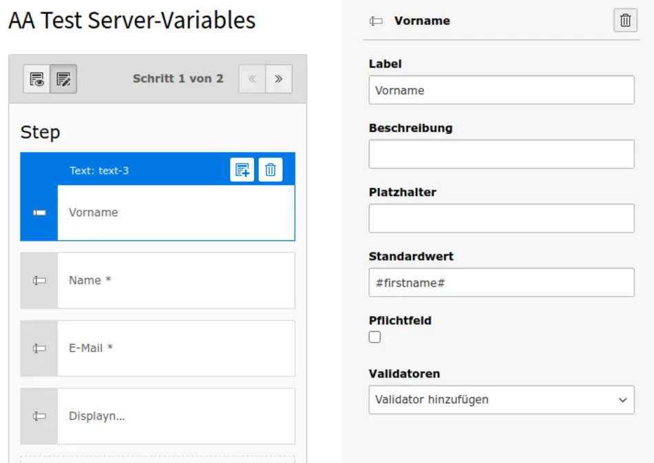 Vorraussetzung: In der Formulardefinition ist für das entsprechende Formularfeld das Attribut "Standardwert" mit "#name#", "#firstname#", "#lastname#" oder "#email#" gesetzt.