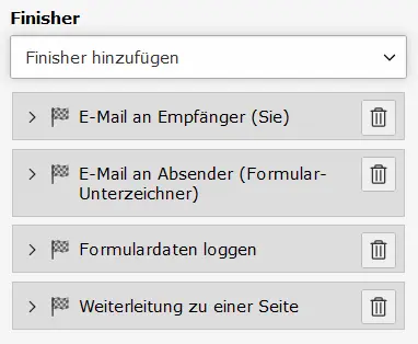 Finisher werden in der Reihenfolge ausgeführt, die Sie in Ihrer Formulardefinition festgelegt haben. Dies ist besonders wichtig, wenn Sie den Finisher Redirect ("Weiterleitung zu einer Seite") verwenden. Stellen Sie sicher, dass dieser Finisher als allerletzter ausgeführt wird. Der Redirect-Finisher hält die Ausführung aller nachfolgenden Finisher an, um die Umleitung durchzuführen. D.h. Finisher, die nach dem Redirect-Finisher definiert werden, werden auf keinen Fall ausgeführt.