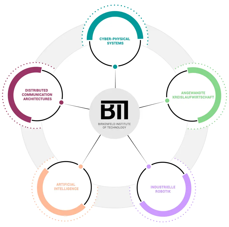 The Birkenfeld Institute of Technology is dedicated to researching and developing innovative methods for optimising industrial production processes in robotics, manufacturing and assembly. A main focus is on the reduction of resource consumption, energy consumption and CO2 emissions as well as the promotion of the circular economy. At the same time, central research topics such as distributed sensor signal processing, algorithms for statistical data analysis, artificial intelligence and the development of distributed systems for the efficient use of large amounts of information from the Internet of Things (IoT) and cyber-physical systems (CPS) are being intensively researched.