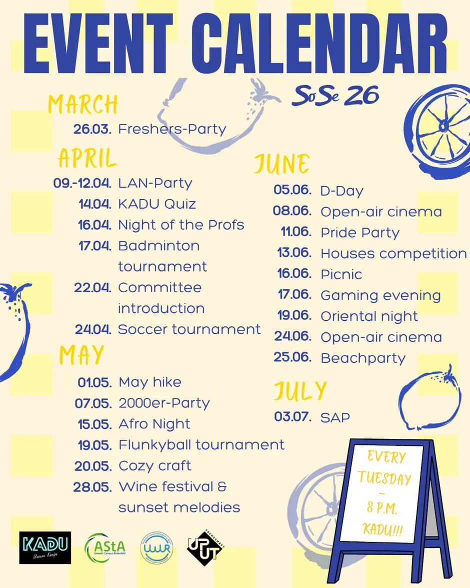Since summer 2023, the AStA has taken over the campus pub. With a dedicated team of students, the Kadu is open for you every Tuesday from 8 pm. This includes the occasional bingo, karaoke or quiz night. Many committee events also take place in the Kadu.