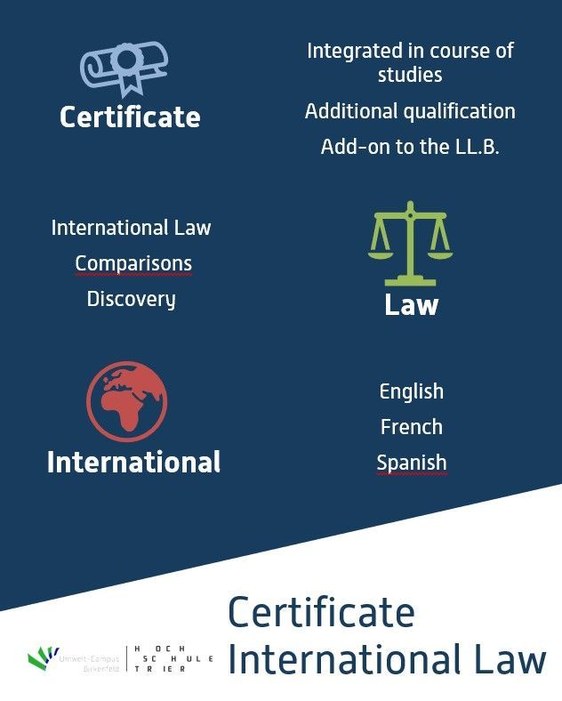 The certificate has a focus on law in the international context. Three specializations are on offer: