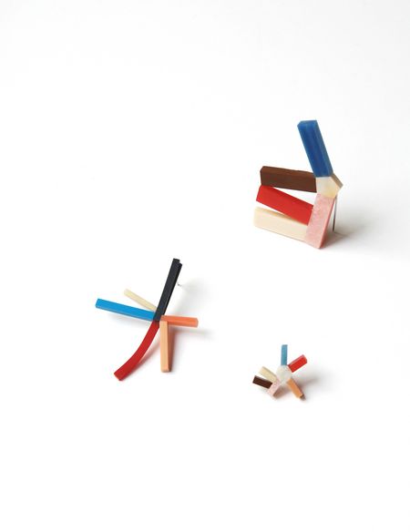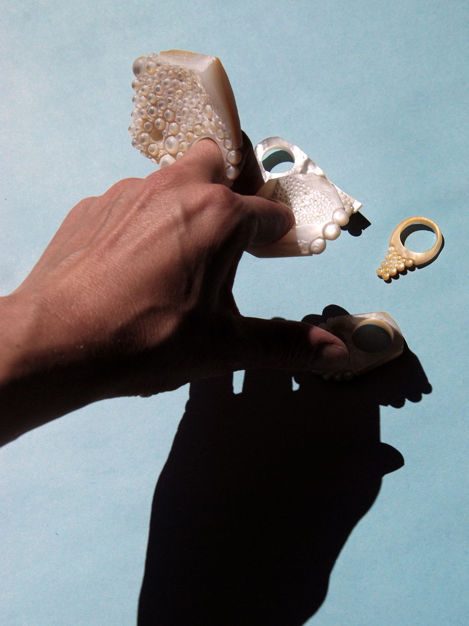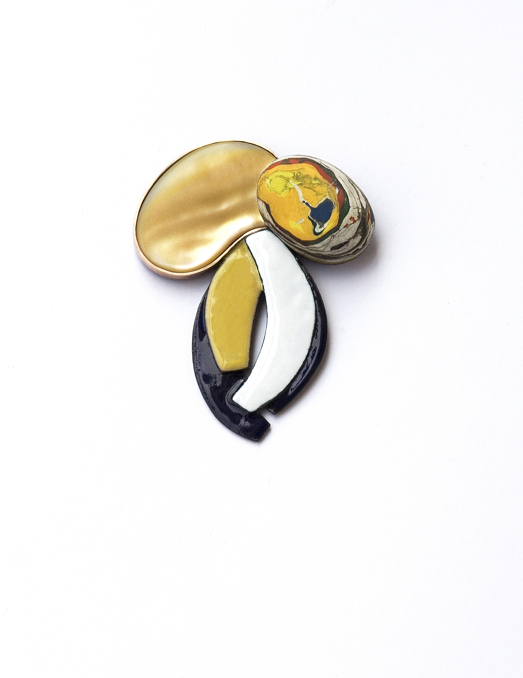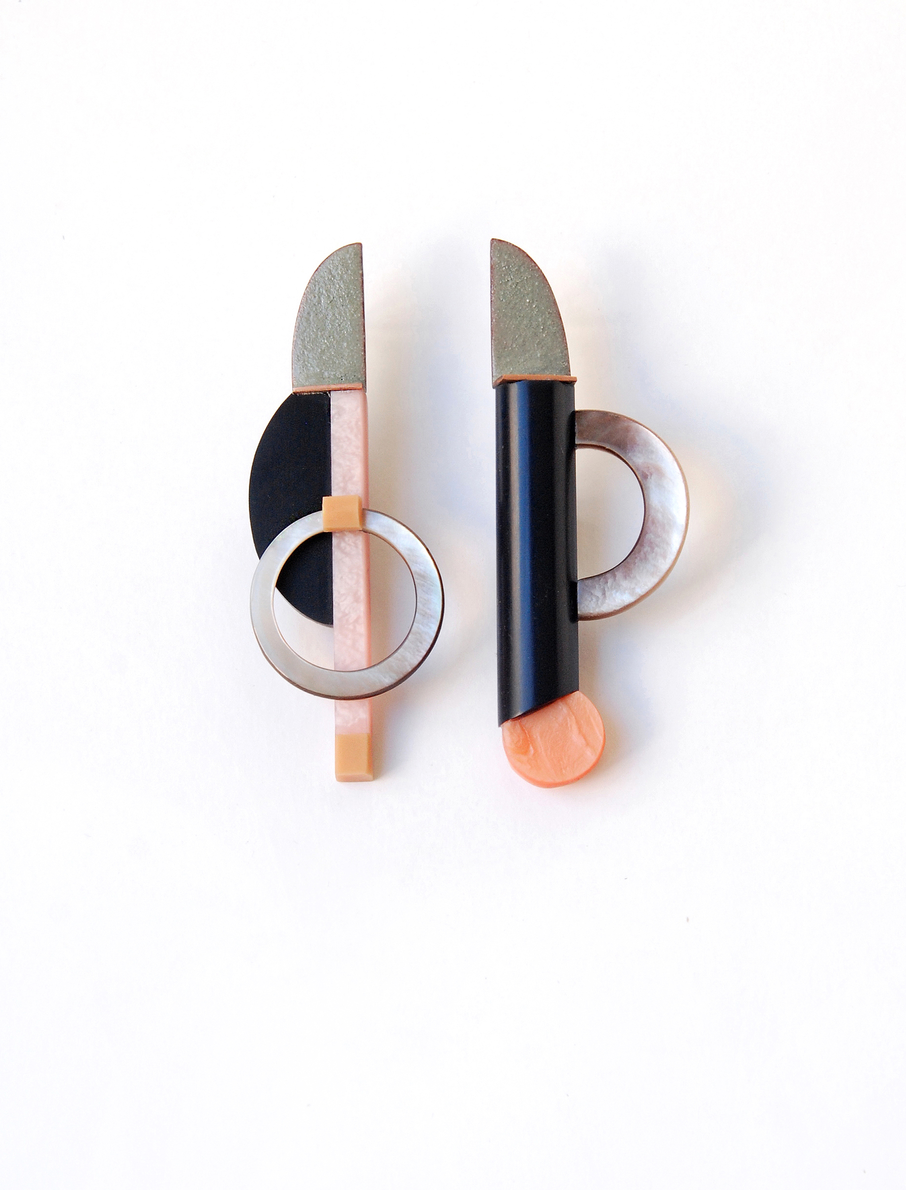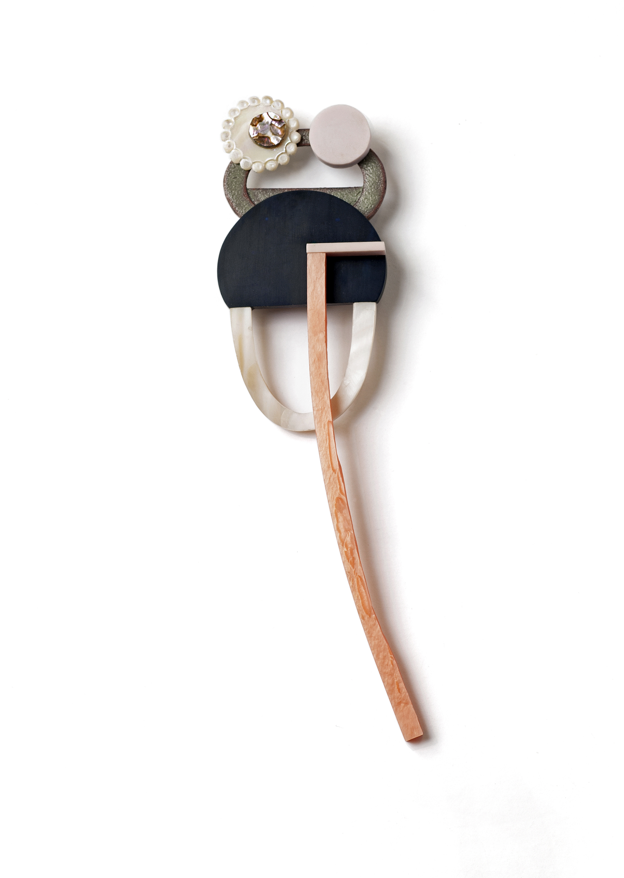 “like the play on stage, I put sequences together to form a choreography - mother of pearl, galalith, plastic, wood, enamel, leftover acrylic paint, found objects - a table full of materials whose origin and occurrence I am aware of, whose properties and colors fascinate me; everything lies there like a big puzzle, a game, a challenge. I put elements together, take them apart again, discard them, rearrange them. time passes. the color and shape variations seem endless - will it be possible to find and realize the “right” interaction? in addition to observations and experiences, chance often helps to find compositions. the playful process is one of the most important steps in my work.”