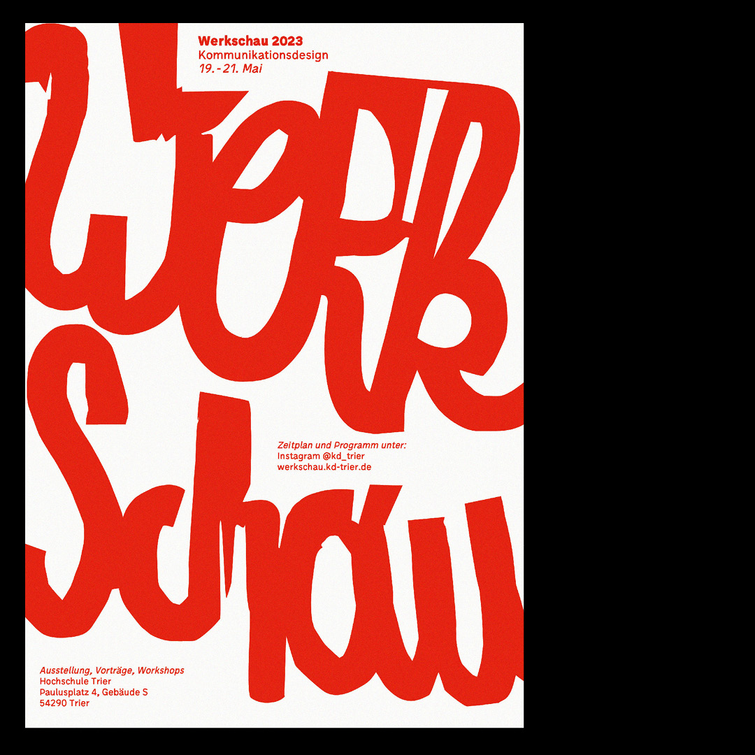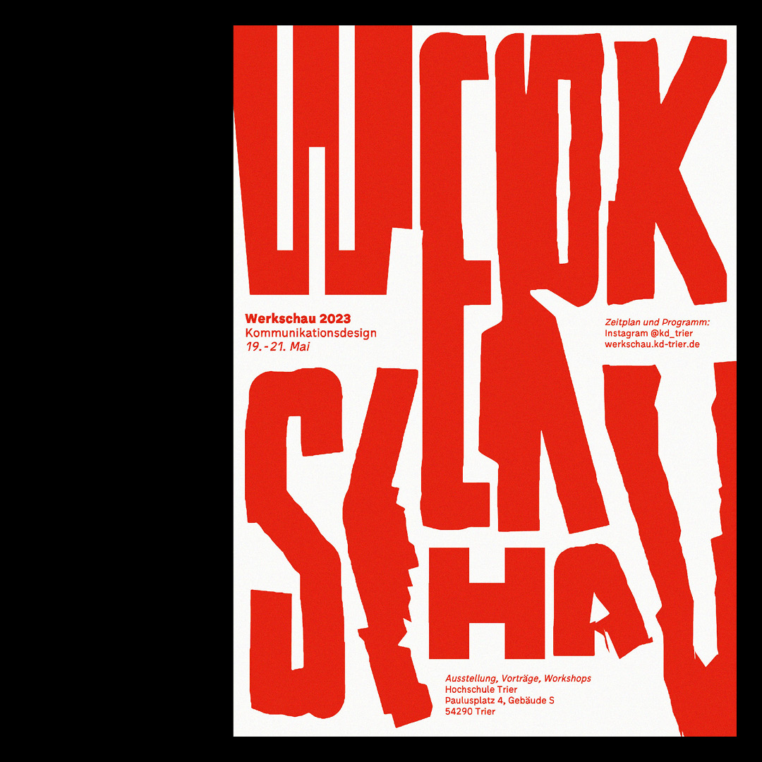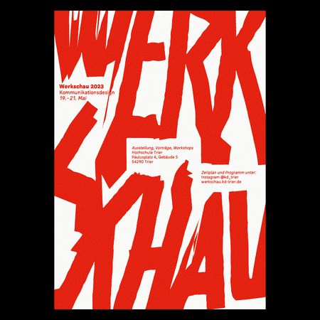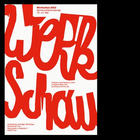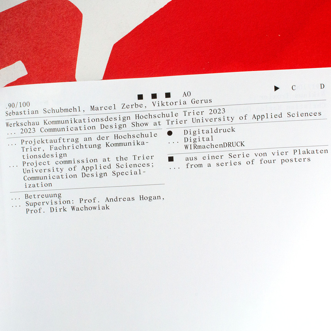 The award-winning posters were designed by Viktoria Gerus, Sebastian Schubmehl and Marcel Zerbe based on the visual identity for the Communication Design 2023 exhibition, which was developed by Sebastian Schubmehl under the supervision of Prof. Andreas Hogan and Prof. Dirk Wachowiak. The posters were printed in the screen printing workshop at Trier University of Applied Sciences by Kelly Azevedo, Anna Biberacher, Katja Friedrich, Leonie Heider, Sora Lee and Lea Napp-Zinn. Digital prints in A0 format will be exhibited.