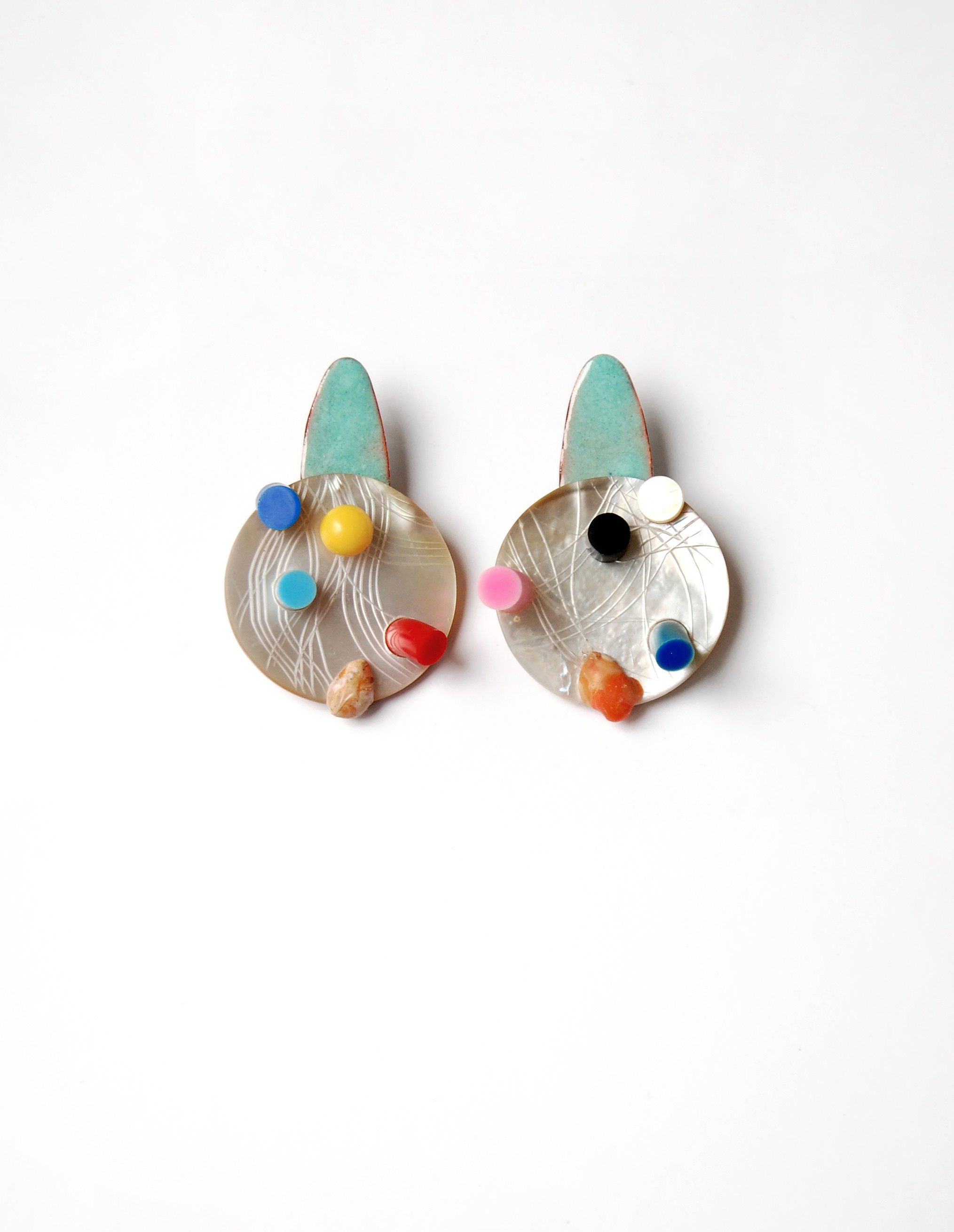 With earjewels – clownerie (2025), Danni Schwaag (Dipl.) develops vividly coloured, hybrid jewellery objects. Enamel, mother-of-pearl, galalith, and plastic come together in playful yet critically reflective works addressing the body, staging, and identity.