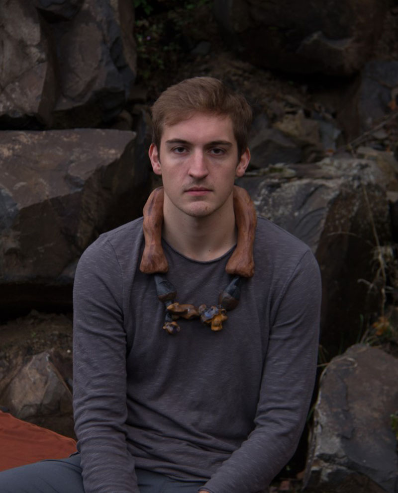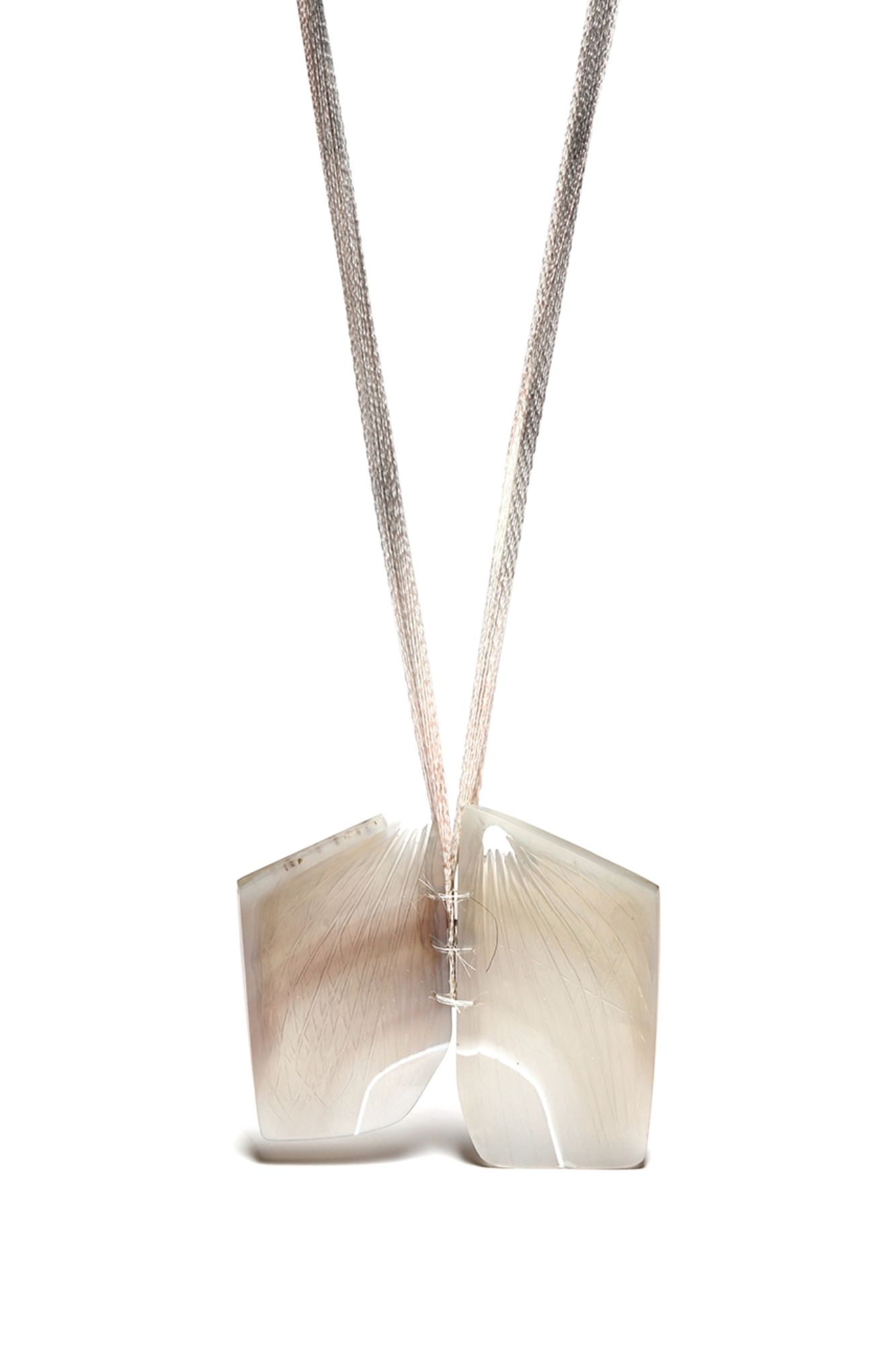 Arianaz Dehghan (MFA) works with agate, human hair, and dyed cotton yarn. Her pendants address themes of closeness, memory, and vulnerability, moving sensitively between bodily reference and personal narrative.