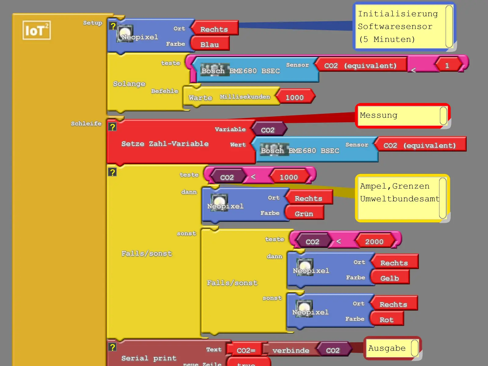 The functional principle: During gas exchange in the lungs, not only CO2 and oxygen are involved, but also other blood components are released into the air. These organic components lead to an increased VOC concentration in the exhaled air. A software sensor in the BSEC library of the BME 680 converts these into equivalent CO2 concentrations. Thus, we only measure the CO2 exhaled by a person. This software sensor could not detect the CO2 of a fizzy bottle. An effect that fits perfectly for our current application. However, the disadvantages should not be concealed here: Also other VOC sources (disinfectants, alcohol, bad breath, formaldehyde) falsify the measurement. So the alarm limits may have to be adjusted a little bit. More information and background information on VOCs in schools, e.g. in the guidelines for indoor hygiene in school buildings of the Federal Environment Agency.