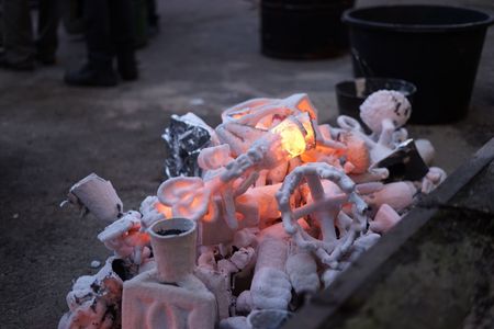The aim of the workshop was to learn the techniques of the casting process using one of the most commonly used materials - iron. The participants were prepared for the practical part in advance in an online seminar. At the beginning of the workshop, they created wax models, which were then used to make around 60 casting moulds. The highlight of the workshop was the casting of these moulds with 780 kg of red-hot iron.