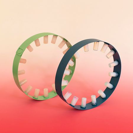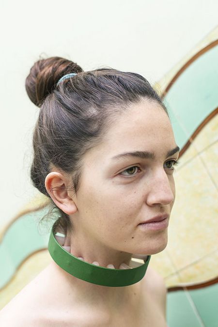 In her more recent works, she is particularly interested in the circle and the additional elements it takes to make it fit the body precisely. The result is a composition of objects with different shapes and materials, such as stone, brass, or wood, which are not only meant to adorn the wearer's neck, but also to refine it.