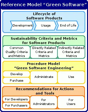 The “Green Software” reference model comprises a holistic lifecycle model for software products, sustainability criteria and metrics of software products, a “Green Software Engineering” procedure model, and recommendations for actions as well as tools.