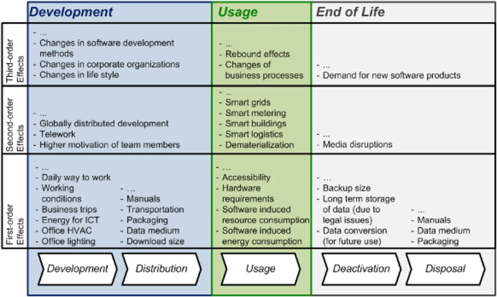 The second- and third-order effects on SD that result from the usage phase, depend on the purpose of the software product. Some software products directly promote sustainability aspects, like resource or energy efficiency, because it is their intended purpose: software that enables smart heating, smart lighting, smart logistics, paper free offices, teleconferencing, etc. In these cases second-order effects can be easily assessed. However, there is also multipurpose software, like word processors, spread sheets, or graphics software. For these, it is nearly impossible to assess second- or third-order impacts, because software manufacturers usually do not know for which purposes their software product is used.