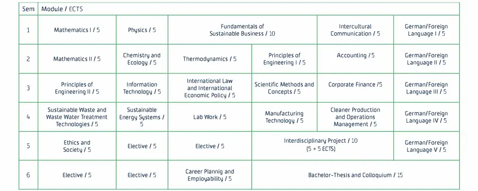 as well as Sustainability. These are supplemented by German courses up to the 5th semester.