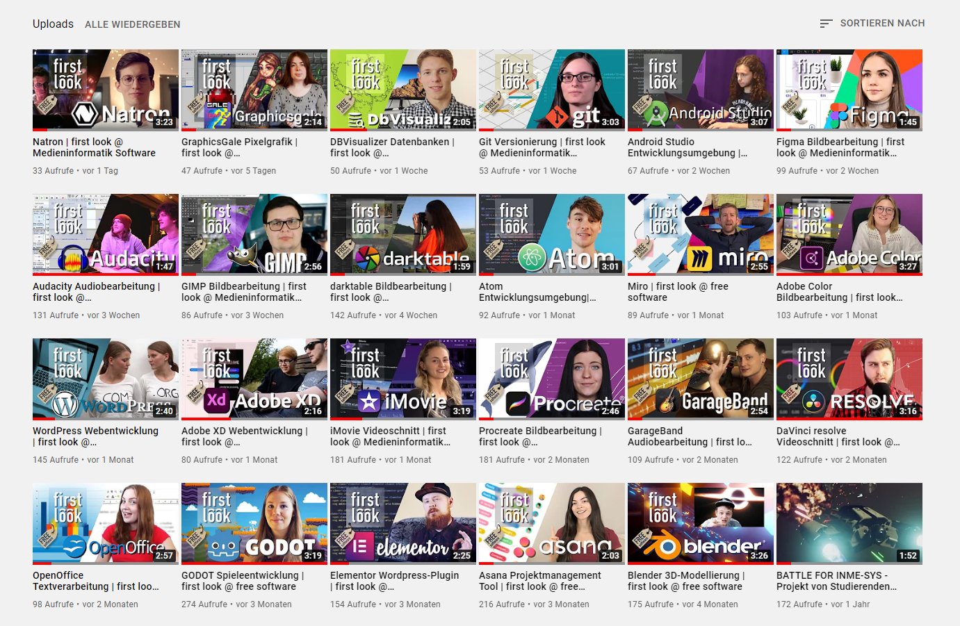 Seit 2021 wird der Youtubechannel für die Medieninformatik Jahren unter der Leitung von Prof. Schönborn mit ganz besonderen Videos bestückt. Sogenannte „First-Look“ Filme – ein Art Unboxing für Software - wurden und werden für eine Reihe Softwareprodukte erstellt.