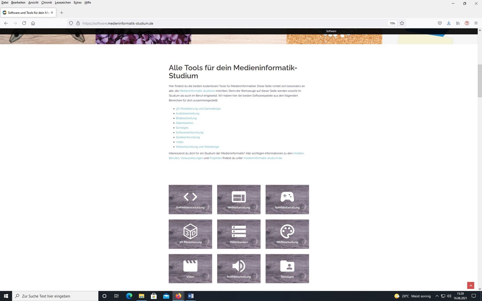 Hierfür wird permanent an ein einer Liste mit für Studierende und Schüler kostenloser Software gearbeitet (https://medieninformatik-studium.de/software/). Studierende verschiedener Veranstaltungen erstellen darauf First-Look-Filme in bis zu 3 Minuten Länge. Die Filme bestehen zumeist aus einem real Anteil sowie Screencast aus den Programmen selber. Insbesondere die Letzteren werden häufig durch eigene Animationen ergänzt. Um die Videos bei YouTube online stellen zu können, ist auch ein gute Audiobearbeitung notwendig.