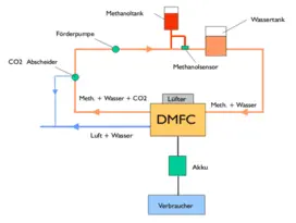Die Regelung des Direkt-Methanol Systems regelt die Leistungsentnahme, die Pumpleistung und die Luftzufuhr auf Basis der Kenndaten Temperatur, Luftfeuchtigkeit und Verbrauch.