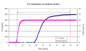 For CO adsorption measurements, a defined CO concentration in hydrogen is passed over the catalyst coated monolith. the exiting flow is detected by an IR spectrometer.
