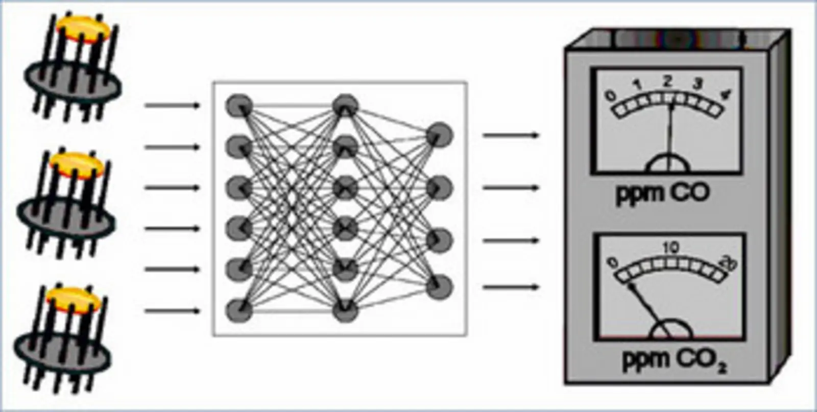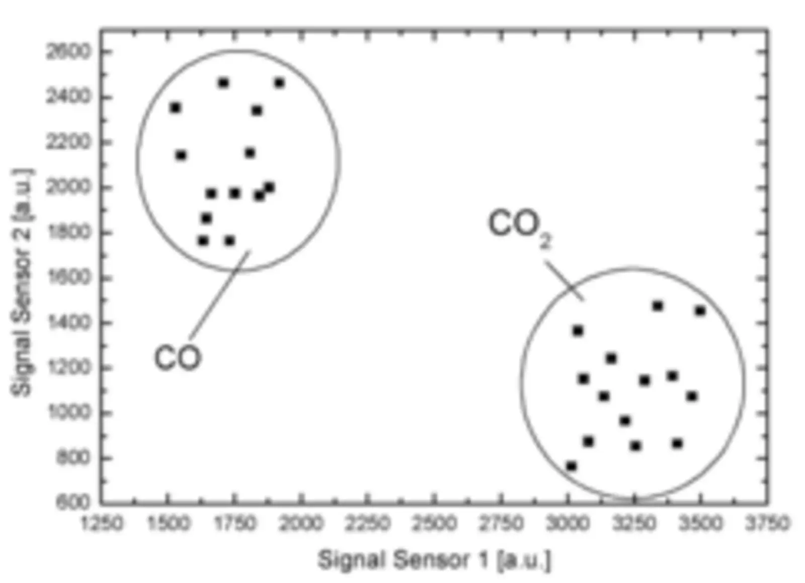Unterschiedlich optimierte beziehungsweise beiunterschiedlichen Temperaturen betriebene Sensoren bilden ein Sensorarray, welches bei verschiedenen Gasangeboten charakteristische Sensorsignale liefert. Neuronale Netze können durch geeignete Verrechnung auf diese Signalbilder „trainiert“ werden. Nach Bestimmung geeigneter Algorithmen können die Gase und Einzelkonzentrationen bestimmt und im Merkmalsraum aufgetragen werden.