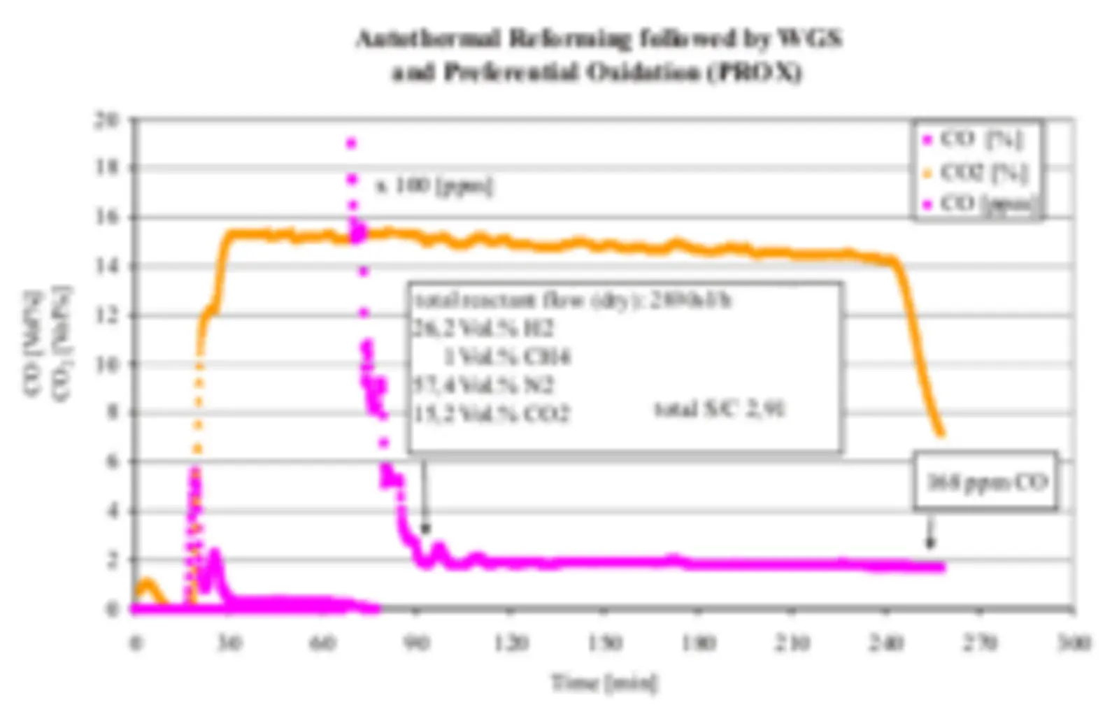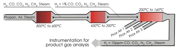 The reformer consists of an autothermal reformer followed by an initial conversion stage based on the water-gas shift reaction. The purification system is completed by a fixed bed reactor in which the gas is cleaned to below 10ppm of carbon monoxide by preferential oxidation [1].