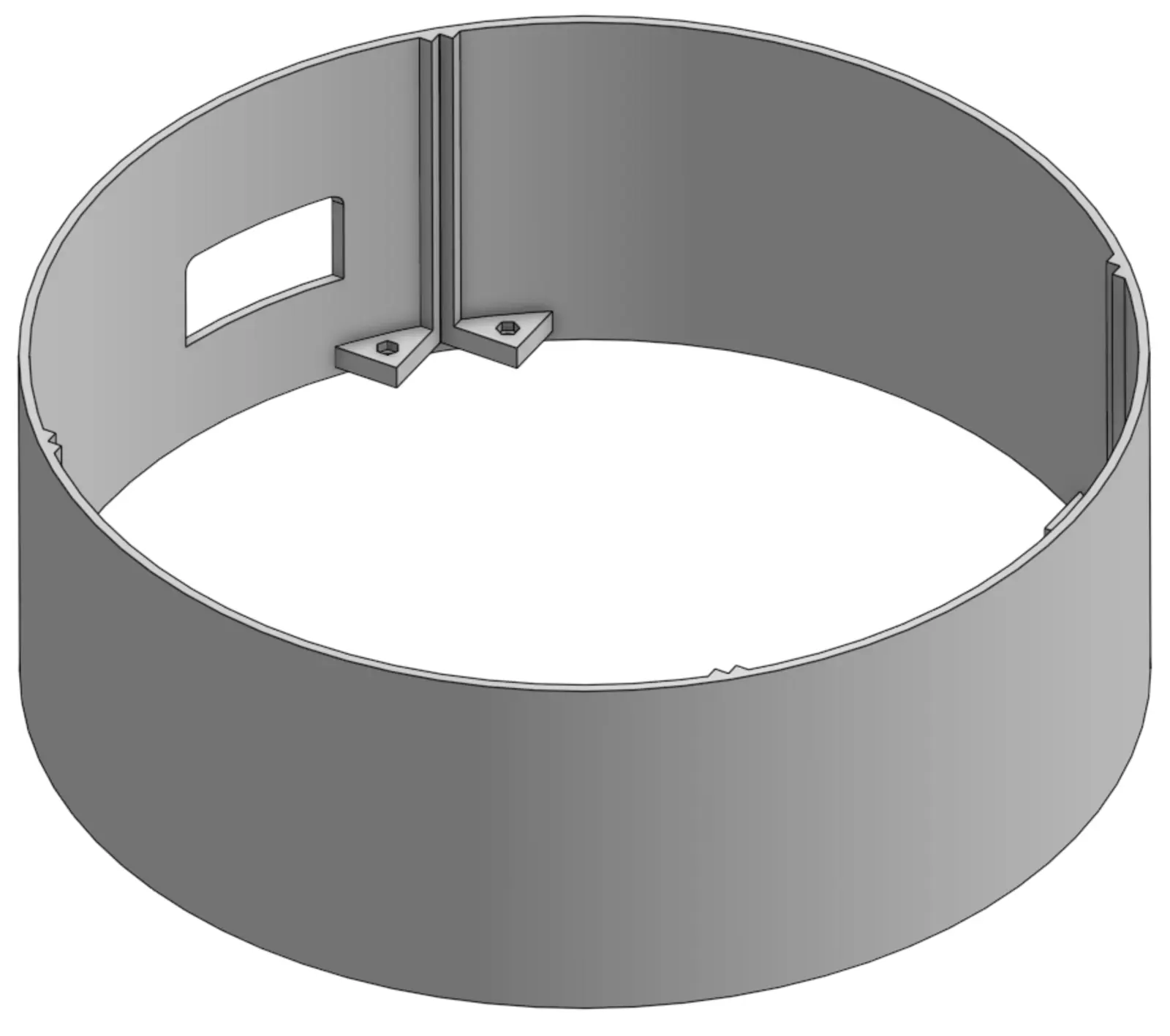 Der gesamte Aufbau des Gehäuses besteht aus einer runden Boden- und Deckelplatte aus Plexiglas, die mit dem Lasercutter im INNODIG zurechtgeschnitten wurden. Das eigentliche Gehäuse, bestehend aus einem "Rohrstück", das im Inneren mit Anschraubpunkten für den Rahmen aus Aluminiumprofilen versehen ist, wurde mit unserem professionellen 3D-Drucker aus ABS-Filament gedruckt. Anschließend wurde das Gehäuse abgeschliffen, um eine matte Oberfläche beim ABS-Kunststoff zu erhalten.
