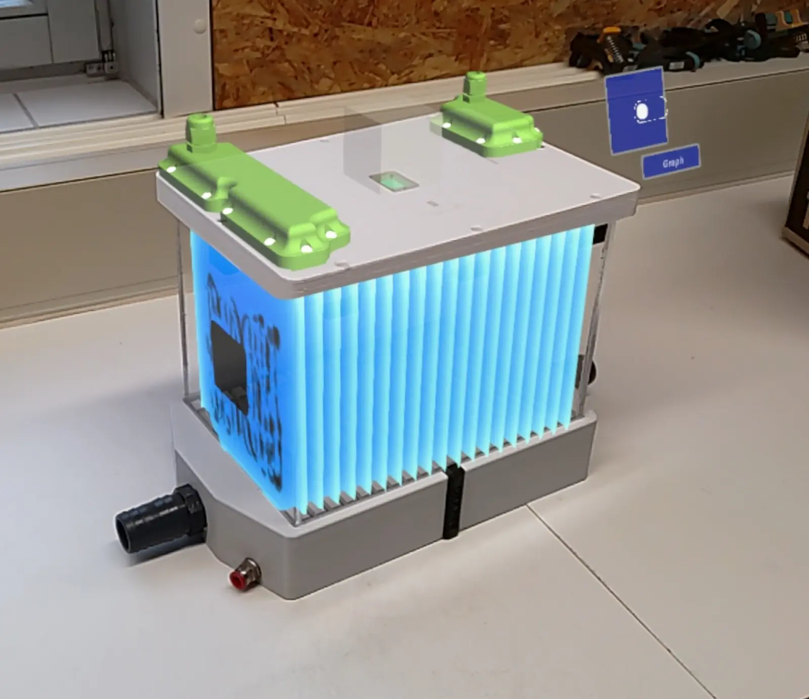 Mit Hilfe der AR-Brille wurde, aufbauend auf der Infrastruktur des digitalen Zwillings des Bioreaktors eine prototypische Anwendung entwickelt, die es erlaubt, die aufgezeichneten Versuche und Simulationen über das leere Modell des Bioreaktors zu legen und diese so immersiv wiederzugeben. Die Anwendungsmöglichkeiten reichen dabei von der Darstellung der Daten zur Versuchsüberwachung, über die Planung von Erweiterungen des Modells (Rapid Prototyping), die Schulung von Anwendern, Aufbau- und Reparaturanleitungen bis zur aktiven Fernsteuerung des Reaktors während der Versuchsdurchführung.
