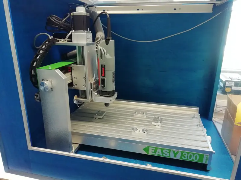 Bei der EAS(Y) 300 Mini handelt es sich um eine mittlerweile betagte Portalfräse die aber bis heute fast unverändert hergestellt wird (Herstellerlink). Leider lief sie nur noch mit der Originalsoftware welche einen Rechner mit Windows XP benötigte. Da das alles nicht mehr zeitgemäß war, kam die Idee auf die Fräse auf die freie CNC Steuerungssoftware LinuxCNC umzurüsten. Hierfür wurde zunächst ein halbwegs aktueller PC mit Parallelport benötigt, über den dann die Steuerbefehle an die Schrittmotor-Steuerung weitergeleitet werden. Anfangs standen die Zeichen ganz gut, dass die originale Endstufe noch benutzbar ist, jedoch scheiterten die Versuche an der mangelhaften Dokumentation der Schnittstelle. Letzten Endes verschmorte ein Bauteil der Endstufe, so dass sie ganz ersetzt werden musste.