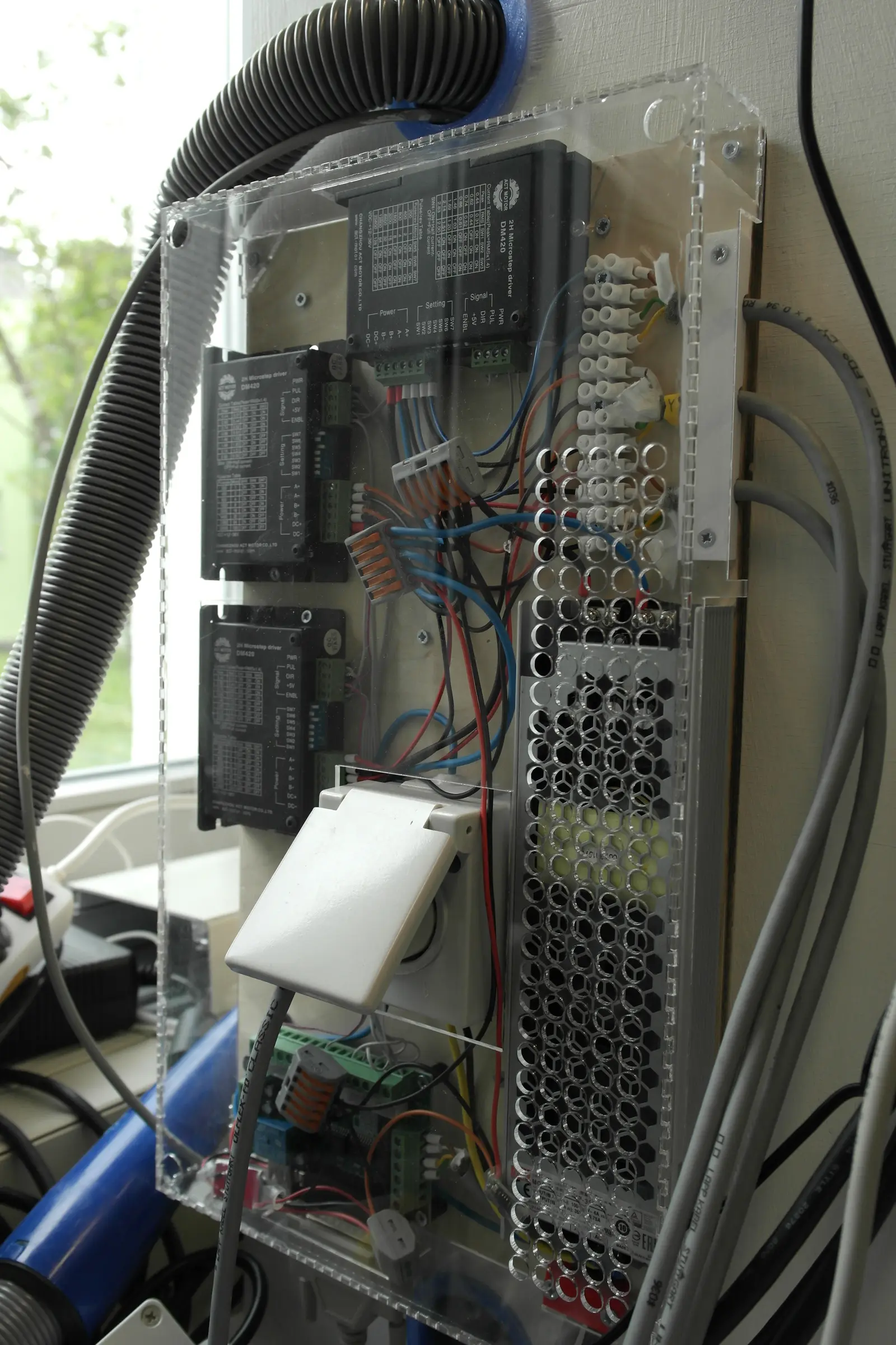 Die neue Steuerung besteht aus einem günstigen 5-Achsen CNC Controller, drei dedizierten Schrittmotortreibern und einem 36V Netzteil.