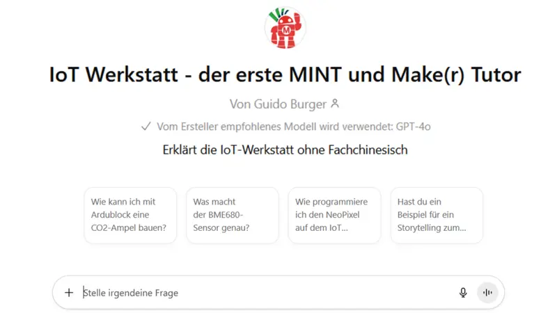 Dieser KI‑Coach ist ein experimentelles Projekt zum Einsatz von genAI in Lehre und Hobby und basiert auf unserem OER‑Büchlein „MINT macht Mut“, unserem MINT-Koffer, sowie einem externen KI‑System (ChatGPT) zur Beantwortung deiner Fragen. Zur Nutzung wird ein Zugang zu ChatGPT benötigt. Bitte beachte: