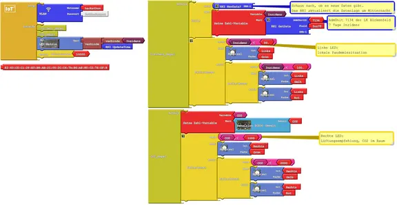 Damit taucht die Bekämpfung (auch zukünftiger) Pandemien in eine neue Dimension. Plötzlich kann ein so einfaches Gerät wie eine Luftgüteampel als Teil eines vernetzten Systems auf wichtige Informationen über das regionale Infektionsrisiko zurückgreifen. Die intelligente IoT-Luftgüteampel kann die Warngrenzen tagesaktuell und ortsbezogen anpassen. Unser Beispielprogramm in der nebenstehenden Abbildung realisiert neben der CO2-Ampel (rechte LED) auch eine Inzidenz-Ampel (linke LED) für den LK Birkenfeld. Allein die Möglichkeit, altersabhängige Inzidenzen zu ermitteln, eröffnet uns sogar die Möglichkeit, Lüftungskonzepte abhängig von der im Raum anwesenden Gruppe zu gestalten. Sollten, wie aktuell gegeben, die jüngeren Altersgruppen stärker betroffen sein, so könnte das bei der Lüftung im Klassenraum der Schule direkte Berücksichtigung finden. Eine Ampel im Seniorenwohnheim würde dagegen eher die Inzidenzen der älteren Jahrgänge analysieren. Hier gibt es sicher noch weiteren Forschungsbedarf, um solche inzidenzabhängigen Warngrenzen zu definieren.