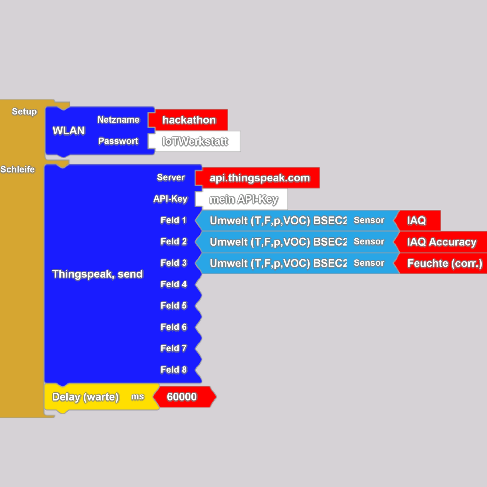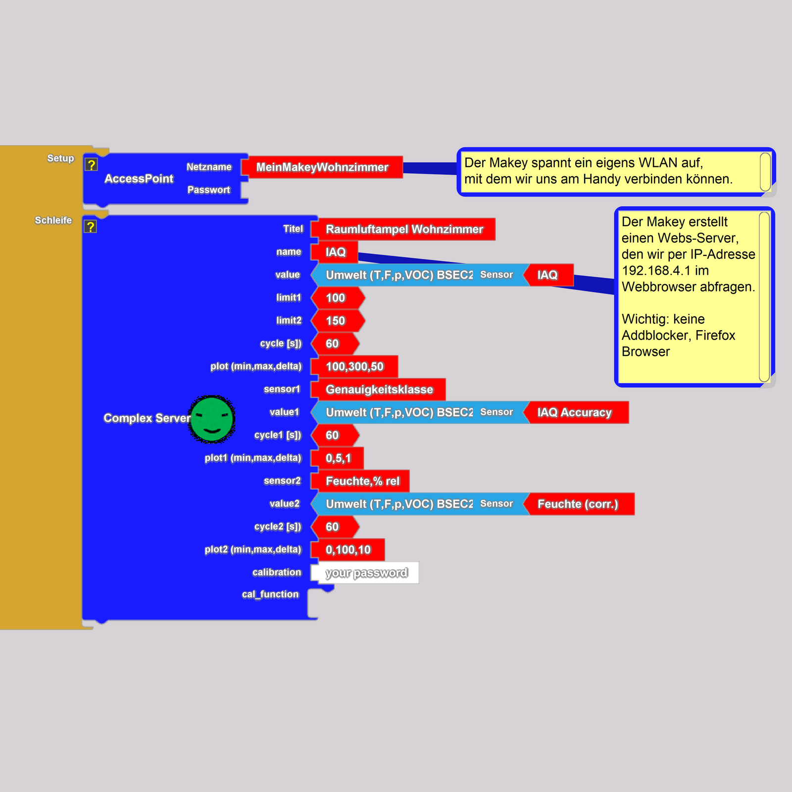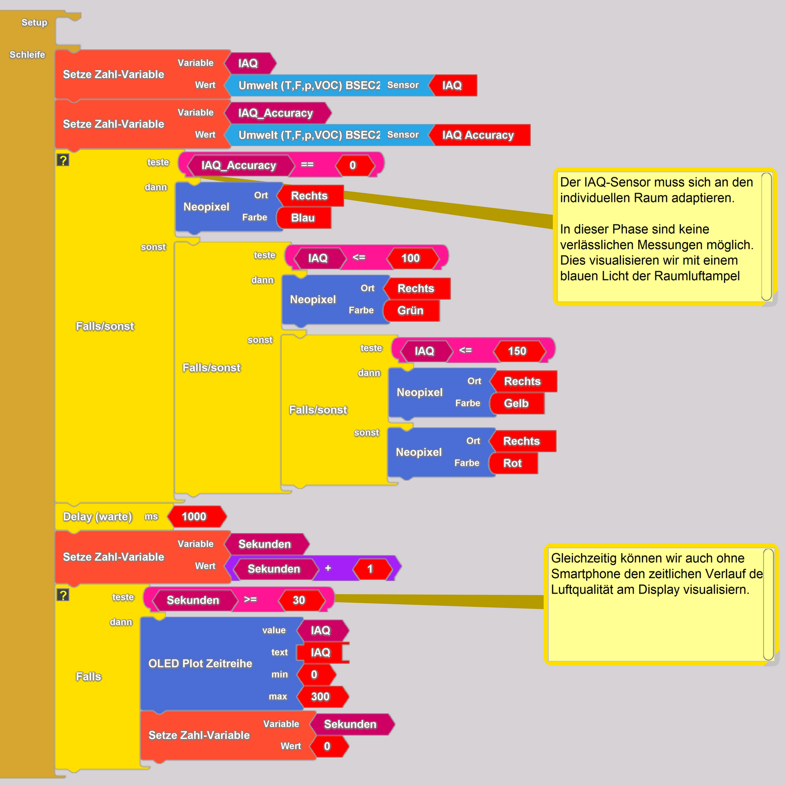 Dazu benötigen wir einen Sensor für die Luftqualität. Hier gibt es zwei Varianten: Die verbreitete Variante sind CO2-Sensoren wie der SCD 30 von Sensirion, der per I2C-Grove an den Microcontroller angeschlossen wird. Typisches Messverfahren für Kohlendioxid ist die Infrarot-Absorption. Alternativ kommen VOC-Sensoren wie der BME 680 von Bosch zum Einsatz. Das Funktionsprinzip: Beim Gasaustausch in der Lunge sind nicht nur CO2 und Sauerstoff beteiligt, sondern es gehen weitere Blutbestandteile in die Luft über. Diese organischen Komponenten führen zu einer erhöhten VOC-Konzentration der ausgeatmeten Luft. Ein Software-Sensor in der BSEC-Bibliothek des BME 680 rechnet diese in equivalente CO2-Konzentrationen um. Wir messen damit also nur das von Personen ausgeatmete CO2, das CO2 einer Sprudelflasche könnte dieser Softwaresensor nicht detektieren. Ein Effekt, der für unsere aktuelle Anwendung geradezu ideal passt. Allerdings sollen die Nachteile hier nicht verschwiegen werden: Auch andere VOC-Quellen (Desinfektionsmittel, Alkohol, Mundgeruch, Formaldehyd) verfälschen die Messung. Ggf. müssen die Alarmgrenzen also etwas angepasst werden. Mehr Informationen und Hintergründe zu VOC in Schulen z.B. im Leitfaden für die Innenraumhygiene in Schulgebäuden des Umweltbundesamtes.