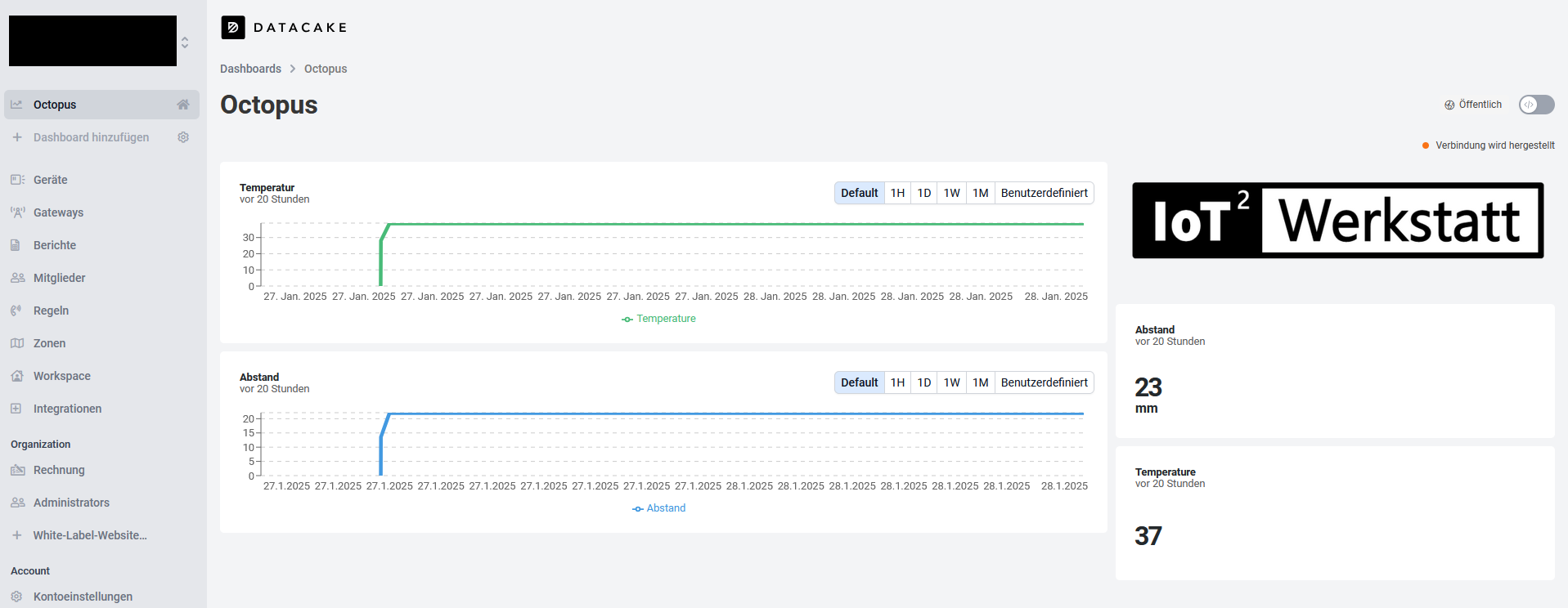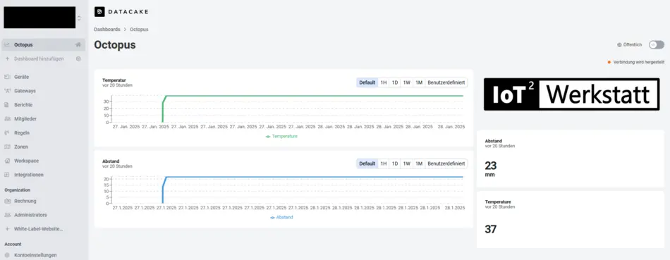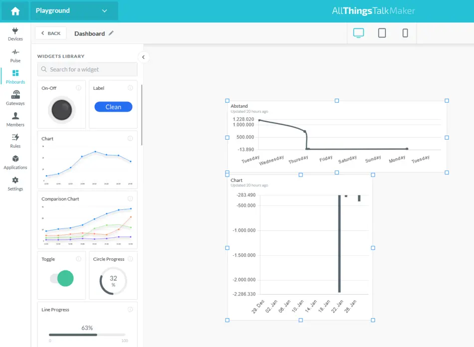 Wer Spaß an der Datenvisualisierung hat, kann recht simpel auch andere Plattformen verwenden. Viele IoT-Plattformen bieten kostenlose Zeiträume an, die ihr zum Austesten der Plattformen nutzen könnt. Für kleinere Projekte gibt es bei einigen Plattformen auch kostenlose Angebote mit begrenzter Anzahl Geräte, die verbunden werden können. Hier einige Beispiele mit simulierten Daten: