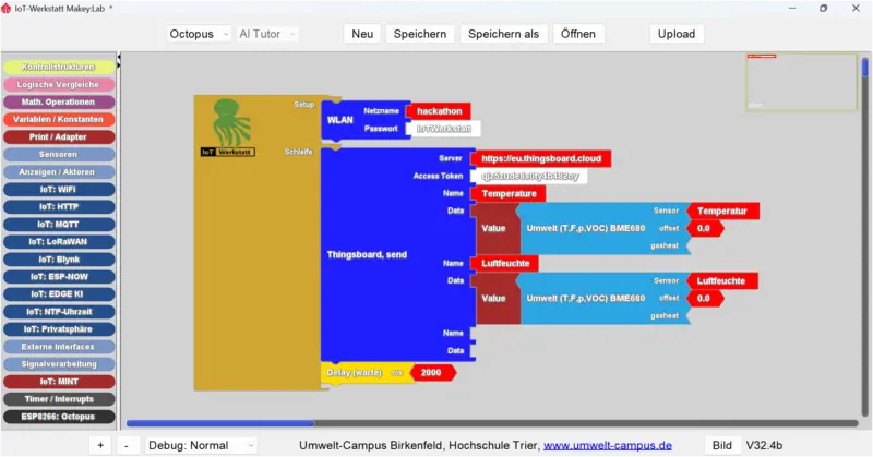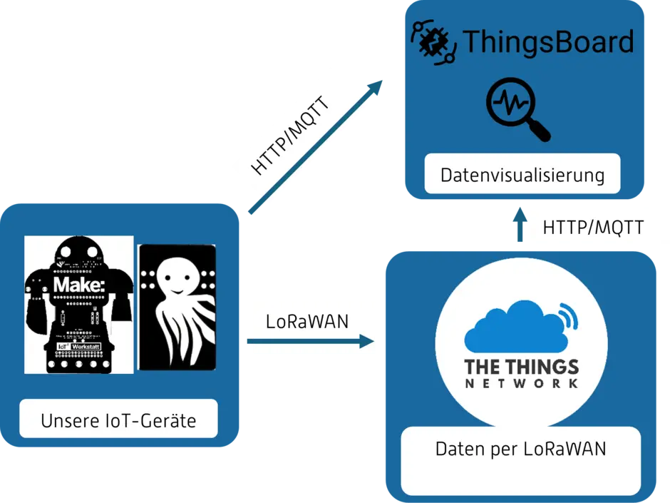 In verschiedenen Tutorials wie "Schulklima: Daten in der ThingSpeak-Cloud" , "Internet of Everything: Octopus trifft IFTT, MQTT und Alexa" oder "MitmachKlima: LoRaWAN" haben wir bereits gelernt, dass unsere Octopus-Platine verschiedenste Daten mittels onboard- oder externen Sensoren erfassen und transportieren kann. Es wurden verschiedene Methoden zur Datenübetragung gezeigt und auch schon visualisiert. Was aber, wenn wir nun viele Daten von verschiedenen Sensoren bekommen, die alle überwacht, analysiert und visualisiert werden sollen? Wenn vielleicht noch weitere Sensoren dazu kommen sollen, oder weitere Nutzende? Oder wenn Daten anschließend noch weitergeleitet und -verarbeitet werden sollen?