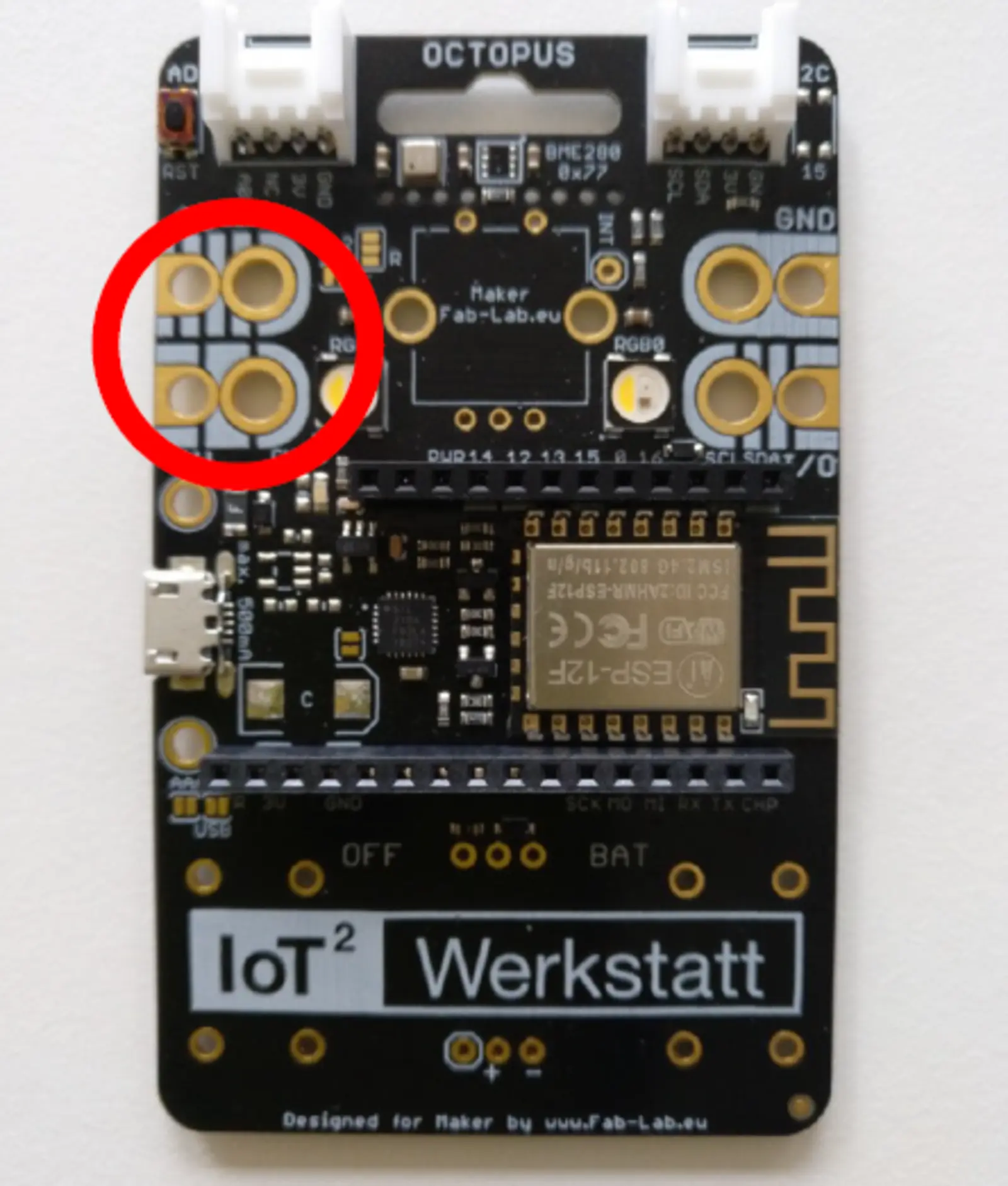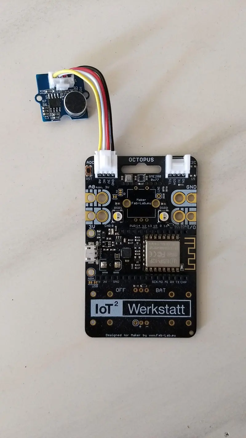 linken Grove-Anschluss des Octopus an. (siehe Abbildung 12). Jetzt müssen wir noch einen Grenzwert festlegen, bis zu dem wir die Lautstärke noch als angenehm empfinden. Das Programm (nutze das Bauteil „Analog Read“) mus jetzt so angepasst werden, dass die LED bei angenehmer Lautstärke grün leuchtet und rot, wenn es zu laut wird. Vielleicht ist ja eine solche Lärmampel auch für euer Klassenzimmer geeignet?!!