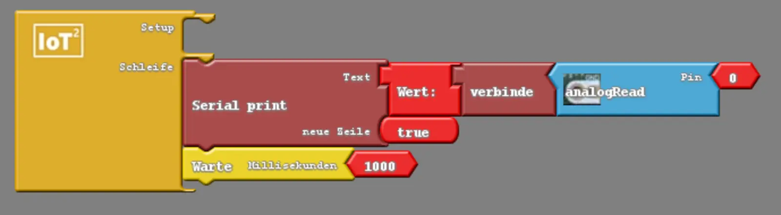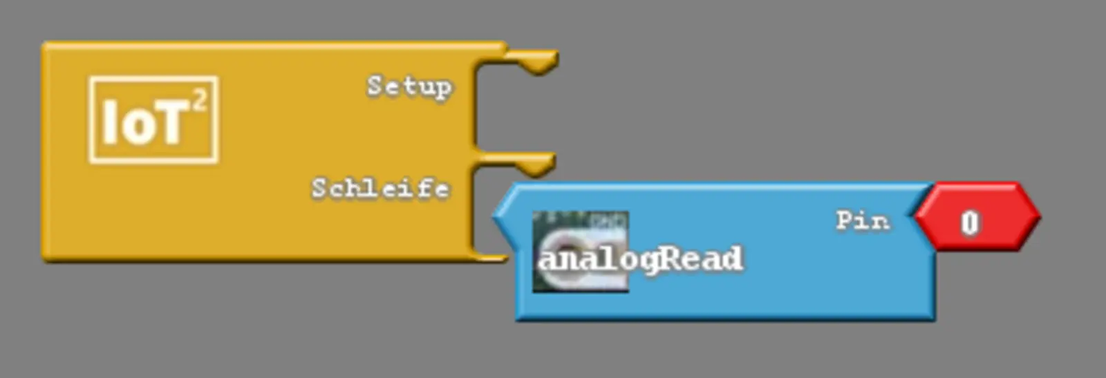 Zu Beginn werden wir uns anschauen, wie man den Wert am analogen Eingang messen kann. Dafür benötigen wir das Bauteil "analog Read" aus der Schublade "Sensoren". Du wirst bemerken, dass das Bauteil nicht in das IoT2-Programmbauteil passt (vgl. Abbildung 4), weil es einen „spitzen“ Anschluss hat. Dies bedeutet, dass es sich um einen Zahlenwert handelt, der vom der vom Sensor erzeugt wird. Solch ein Zahelnwert kann nur zusammen mit einem anderen Bauteil weiterverarbeitet werden - z.B. zur Ausgabe des Zahlenwerts auf dem Bildschirm. Dazu holen wir uns zunächst das Bauteil „Serial print“ aus der Schublade „Kommunikation“ und anschließend, ebenfalls von dort, ein „verbinde“-Bauteil, um den viereckigen mit dem spitzen Anschluss zu verbinden (vergleiche Abbildung 5).