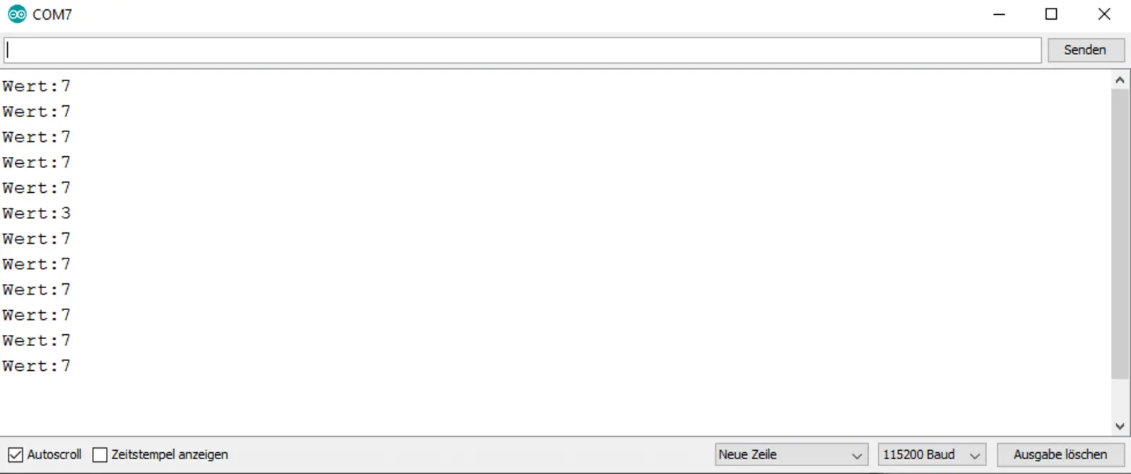 Der serielle Monitor erlaubt es uns, Daten vom Octopus an den PC zu senden und diese in Form von Texten auf dem Bildschirm auszugeben. Da man dort nur Text angeben kann, muss man zuerst Zahlwerte in Text übersetzen. Hierfür benötigen wir die Verbinder als Adapter. Den seriellen Monitor findest du am oberen Rand des Ardublocks (vgl. Abbildung 6). Wenn du auf den Button klickst, öffnet sich der serielle Monitor und es werden die Daten angezeigt, die der Octopus sendet (vgl. Abbildung 7).