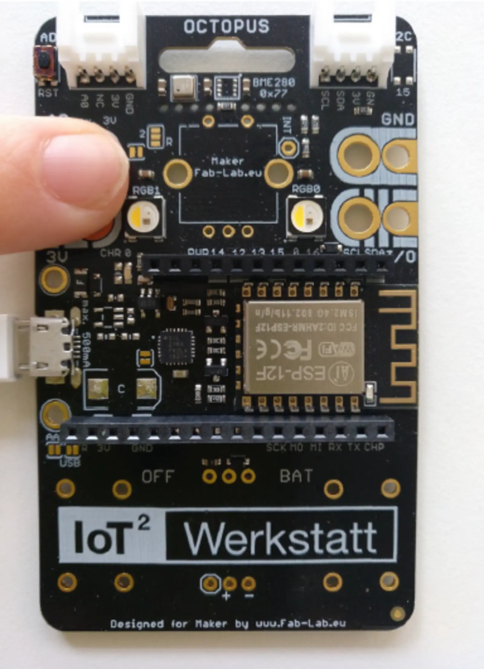Wenn die wir den Finger auf den Kontakt am Ocotpus legen, verändert sich durch den Hautwiderstand die Spannung, die am Kontakt anliegt. Die insgesamt an den mit A0 beschrifteten Kontakten anliegende Kleinspannung wird durch einen Analog-Digital-Wandler (ADC) in einen proportionalen Zahlenwert umgewandelt. In unserem Fall hat der ADC eine Auflösung von 10 bit, was bedeutet, dass unser Messbereich von 0 bis 3 V in die Zahlenwerte 0 bis 210-1 (=1023) umgewandelt wird.