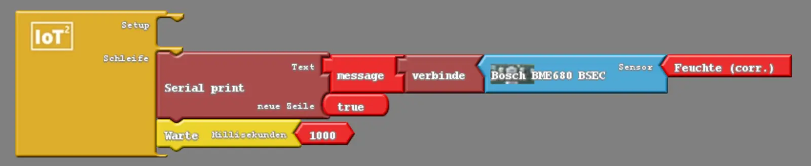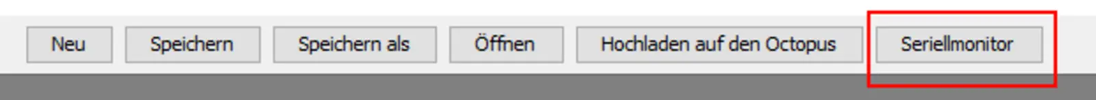 Wir benötigen hierfür das Bauteil "Bosch Umweltsensor BME 680" aus der "Sensoren"-Schublade. Zusätzlich benötigen wir das "Serial Print" aus der "Kommunikation"-Schublade. Zudem benötigen wir das Bauteil "verbinde" aus der selben Schublade, welches du bereits aus Modul 2 kennen solltest und es ermöglicht, Zahlwert auf dem seriellen Monitor ausgeben zu lassen. Wir finalisieren das Programm mit einem "Warte Millisekunden", damit die Daten nur jede Sekunde erfasst und ausgegeben werden. Ansonsten würden die Werte zu schnell auf dem Bildschirm erscheinen, was ihre Auswertung erschweren würde. Wenn wir das Programm auf den Octopus hochgeladen haben, können wir über den "Seriellmonitor" unsere erfassten Daten anschauen (vgl. Abb. 4 und Abb. 5).